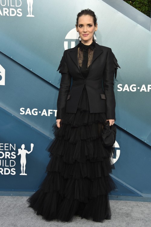 Tampilan ala gothic nan romantis dikenakan aktris Winona Ryder dalam rancangan Maria Grazia Chiuri untuk rumah mode Dior. Palet warna serba hitam di ansambel ini, diimbangi dengan rok pleated bahan tulle yang feminin serta atasan blazer bahan wol yang elegan.