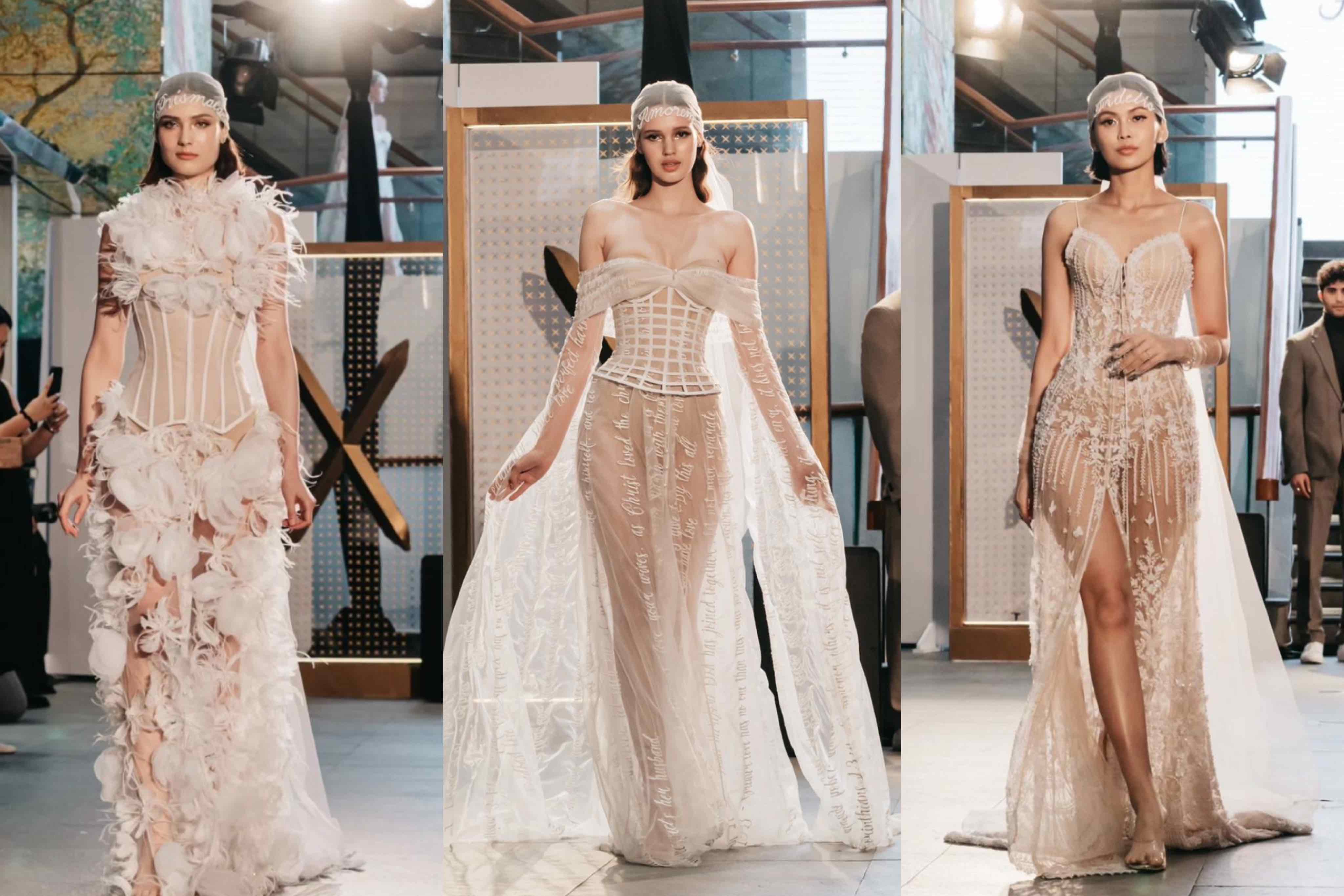 Bagaimana tidak? Acaranya dibuka dengan menampilkan gaun putih lengkap dengan veil, dihiasi bordiran bunga dan korset yang menonjolkan lekuk tubuh, menciptakan gaun sensual yang penuh elegansi. Selanjutnya, gaun berkorset dengan potongan off-shoulder yang dihiasi tulisan puisi cinta memberikan makna mendalam pada gaun tersebut.