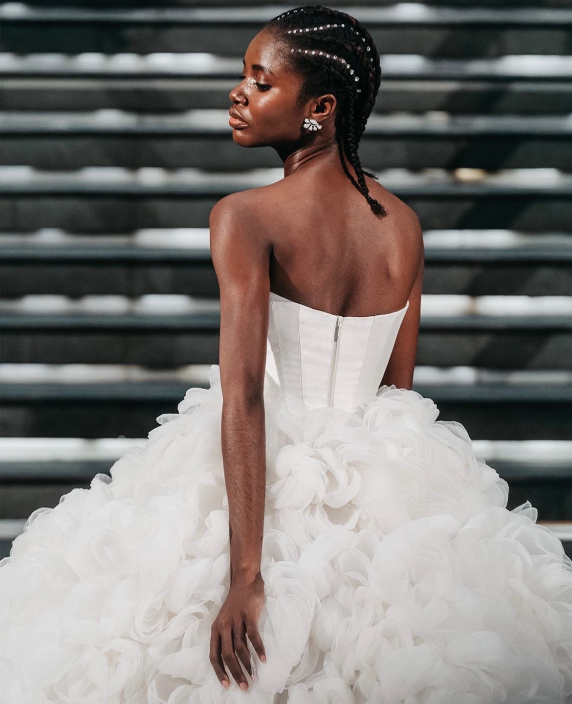 Monica Ivena tampaknya tidak hanya fokus pada pembuatan gaun mewah berkilau, tetapi juga memperhatikan desain gaun yang elegan dan simple melalui penggunaan hiasan bunga yang indah, menambahkan daya tarik yang bersahaja pada gaun-gaunnya.