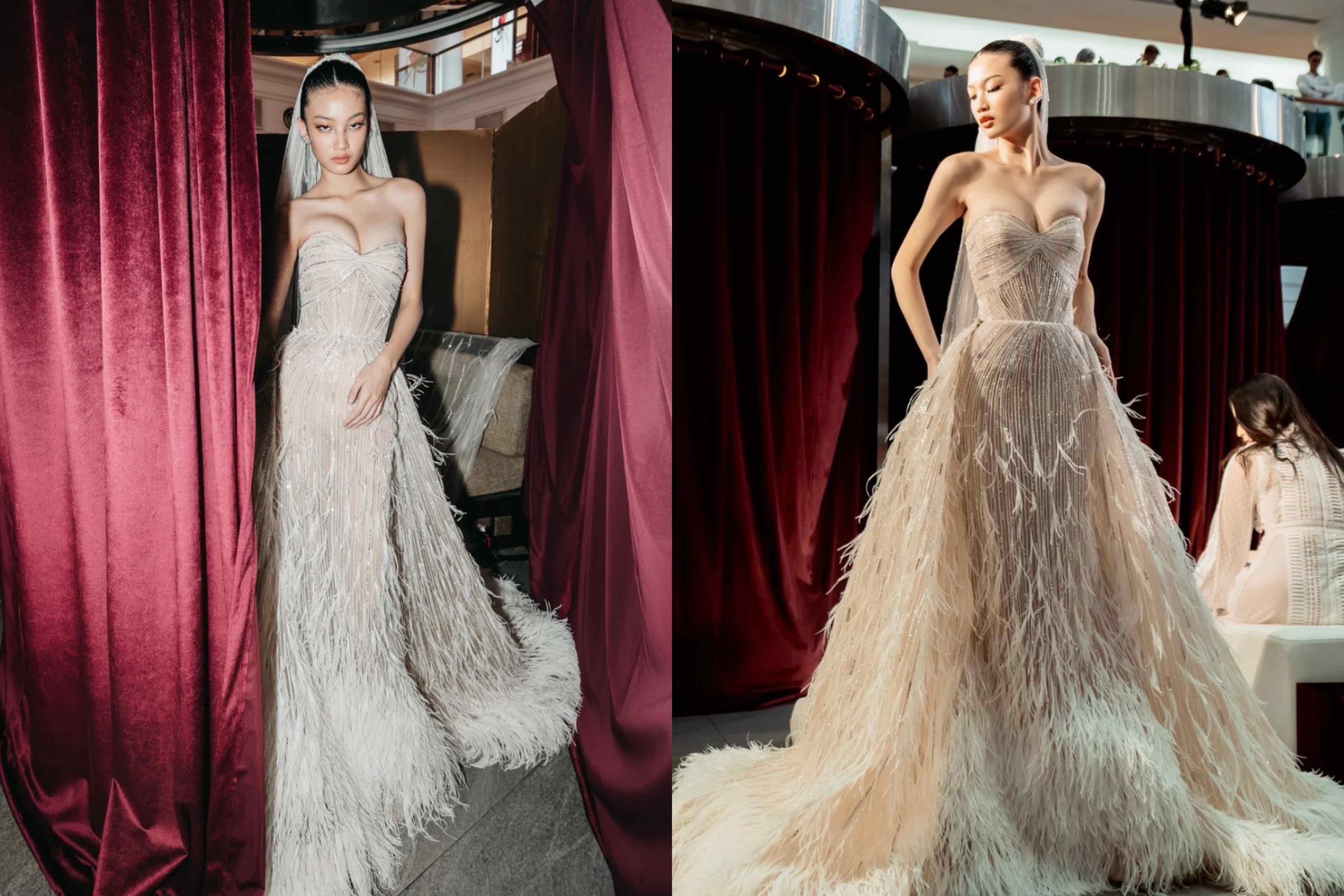 Tak berhenti disitu, Monica Ivena lagi-lagi mengejutkan para tamu undangan dengan mengungkapkan karya-karya hebat lainnya melalui tirai yang dibuka, memperlihatkan sederet gaun mewah yang dipenuhi ratusan, bahkan ribuan kristal mempercantik seluruh koleksinya.
