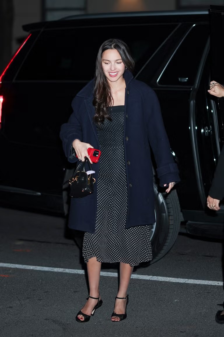 Olivia memadukan gaun strapless-nya dengan sepatu hak tinggi hitam peep-toe yang memikat. Di tangannya, ia membawa tas mini Aventure kulit hitam dari Miu Miu, dipadu dengan casing ponsel merah berbulu. Beberapa cincin perak menambah kilau pada aksesori, sementara ia melengkapi penampilannya dengan peacoat wol biru navy yang elegan di atas gaun polkadotnya.