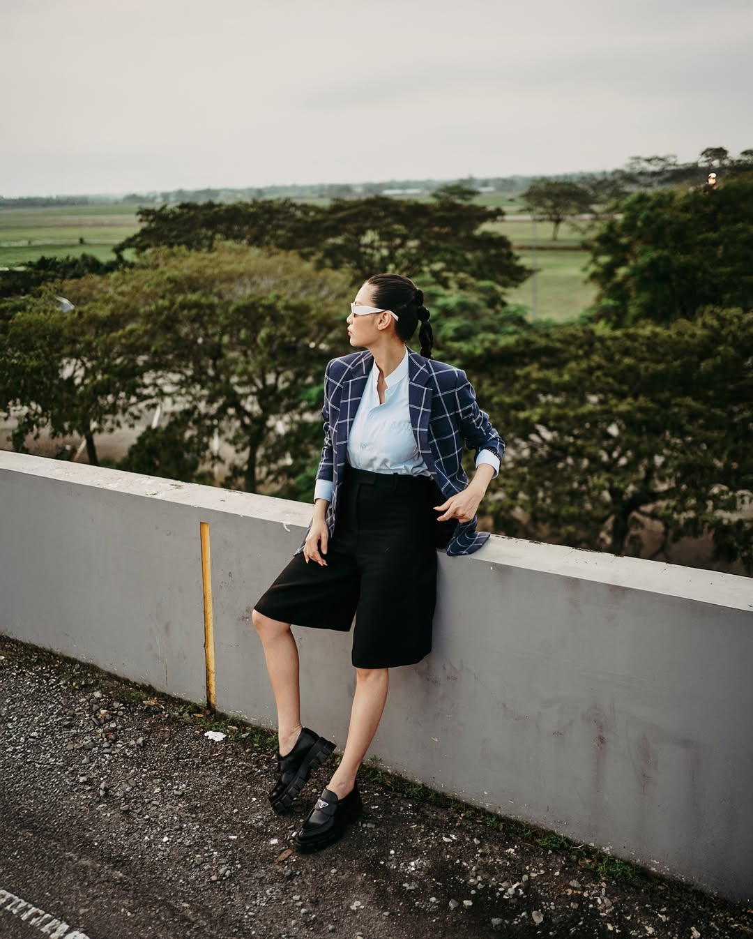 Patricia memilih blazer motif kotak berwarna navy, yang memberikan kesan formal namun tetap santai saat dipadukan dengan kemeja biru muda yang ringan. Untuk melengkapi tampilan ini, ia mengenakan celana pendek hitam dengan potongan tailored yang memberikan kebebasan bergerak tanpa mengorbankan kesan polished. Sepatu loafers hitam menambahkan elemen klasik yang nyaman, menjadikan look ini sempurna untuk berjalan-jalan atau bahkan menghadiri acara kasual di perjalanan.