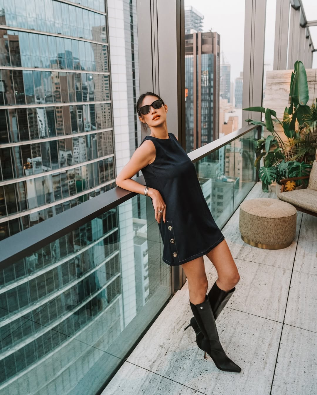 Gaun hitam berpotongan sederhana ini tampak elegan dengan sentuhan detail kancing di sisinya, menambahkan dimensi menarik pada tampilan minimalisnya. Dipadukan dengan boots tinggi yang memberikan sentuhan bold, Patricia sukses menciptakan keseimbangan antara chic dan edgy. Kacamata hitam oversized menjadi pelengkap sempurna, menambah kesan modern yang effortless.