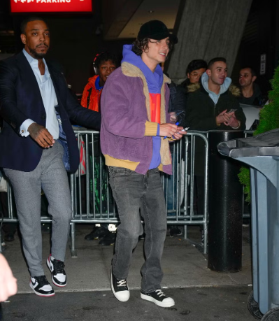 Kylie tampil mencuri perhatian dalam mini dress hitam asimetris yang dipadukan dengan tights hitam mengkilap, sepatu hak tinggi, dan kacamata hitam. Sementara itu, Timothée tampil santai dengan hoodie biru-merah, jaket ungu, jeans abu-abu, sepatu hitam, serta topi baseball hitam.