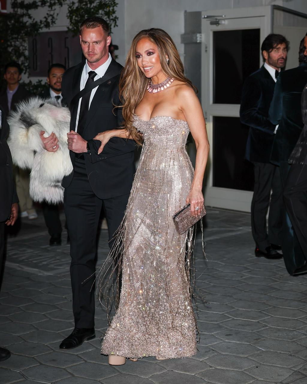 Penyanyi Can’t Get Enough ini terlihat meninggalkan after-party Golden Globes yang digelar Nikki Glaser dengan mengenakan gaun perak tanpa tali berhias rumbai berkilau. Penampilannya dilengkapi dengan tas clutch bertabur kristal serta kalung pernyataan yang mencuri perhatian.