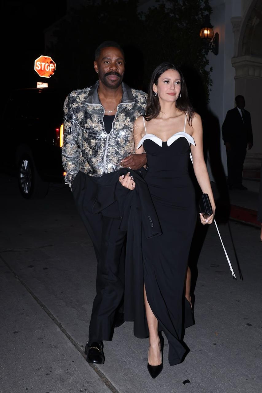 Datang bergandengan tangan ke after-party Golden Globes yang digelar Jas Mathur dan Michael Braun, Nina tampil dalam gaun tali hitam-putih dari koleksi Monot Spring 2021. Sedangkan Colman melengkapi penampilannya dengan jaket biru baja berpayet dan celana hitam.
