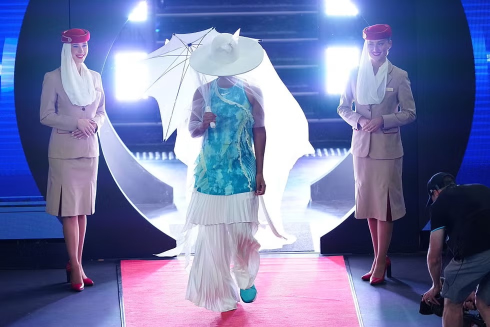 Sementara itu, bagian lain dari tampilan Naomi menghadirkan sentuhan warna lewat minidress Nike biru kehijauan dengan detail ruffle bernuansa akuatik. Menghadirkan tren dress-over-pants ke lapangan tenis, gaun tersebut dipadukan secara cermat di atas rok lipit putih dan celana lipit senada yang mengalir ringan. Sneakers aquamarine yang cerah serta anting mutiara menyempurnakan keseluruhan tampilan.