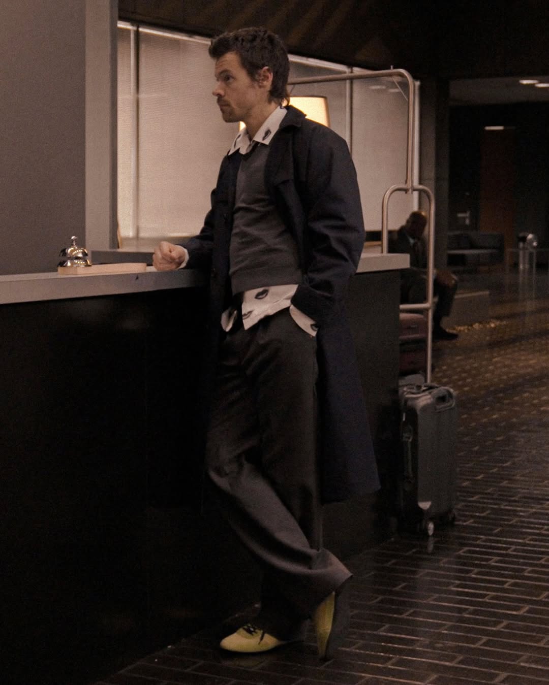 Harry Lambert menambahkan dasi untuk sentuhan rapi lalu menyempurnakan tampilannya dengan celana wol serta sepatu sneakers elastis dengan aksen suede hijau limau, menciptakan momen preppy yang unik dan sedikit “nyeleneh”.