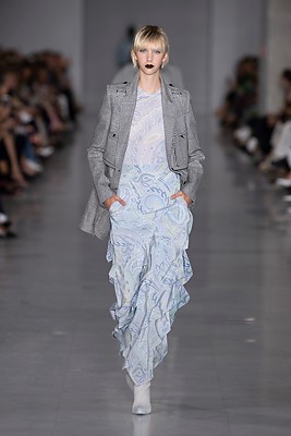 Musim ini Salvatore Ferragamo tidak ingin busana hanya dikenakan untuk satu musim. Busana di koleksi ini adalah pakaian yang dapat mengakomodasi siapa pun di musim apa pun. Salah satunya ada di look berikut, ansambel monokrom dengan injeksi warna biru tua di badan blazer berstruktur tegas tentu tak akan lekang oleh zaman.