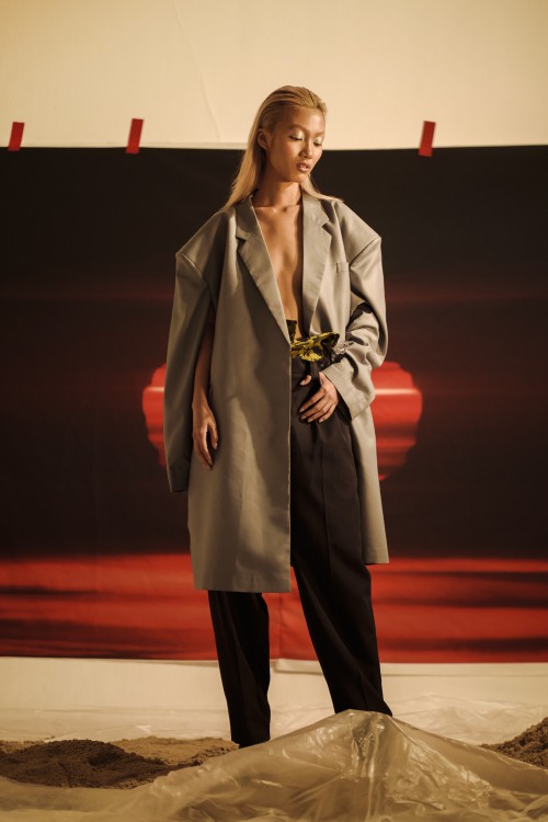 Salah satu contoh datang dari ansambel bagian dari koleksi ini yang merupakan padanan mantel dengan garis bahu berstruktur dan celana high waisted yang menyuarakan gaya tangguh untuk para penyuka gaya maskulin.