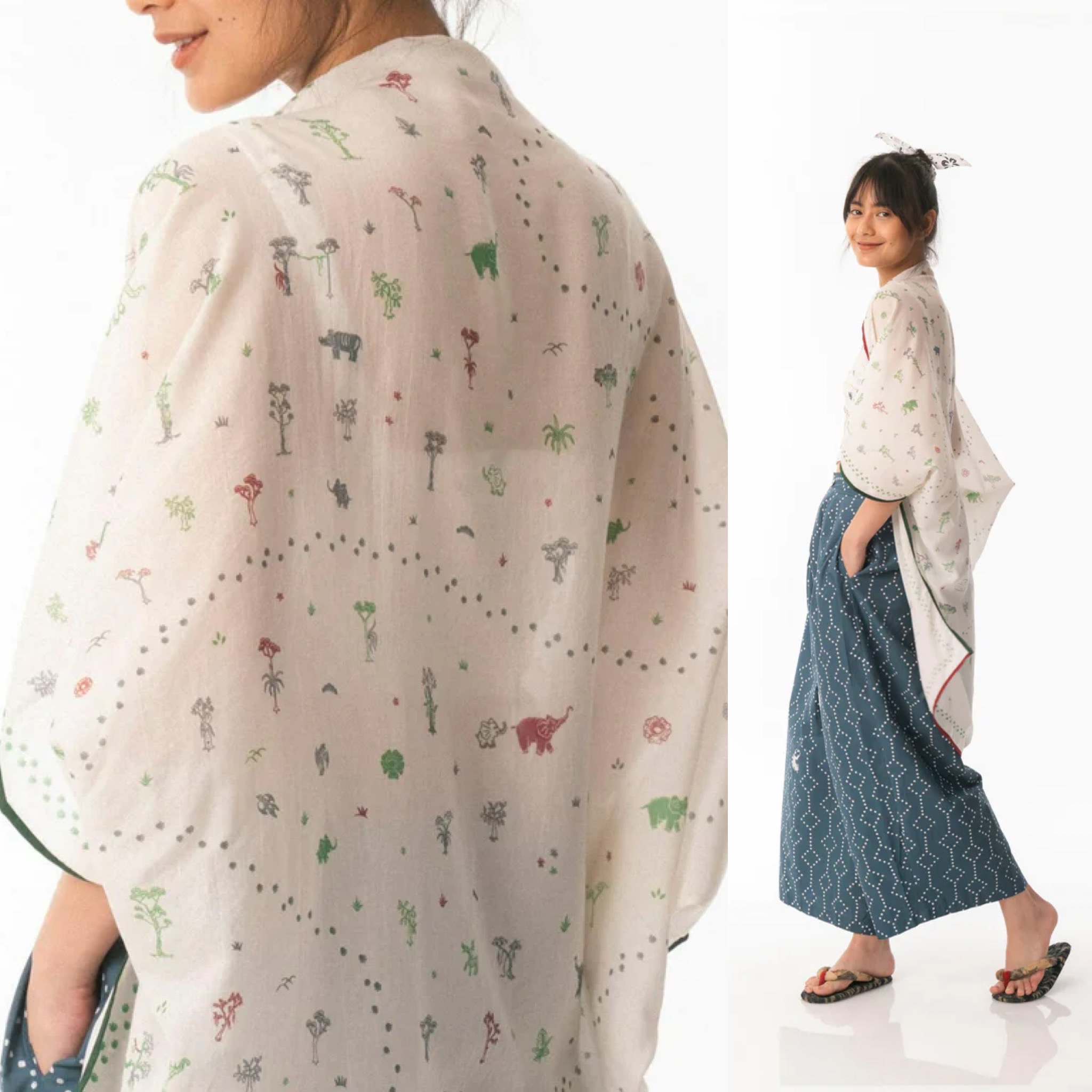 Atasan? Check! Terusan? Check! Sekarang kita ke luaran yang cocok untuk musim panas. "Rimba" outer terbuat dari bahan alami berupa tencel, dipenuhi dengan motif pepohonan dan binatang liar, tak lupa sentuhan kelim manis berwarna merah dan hijau.