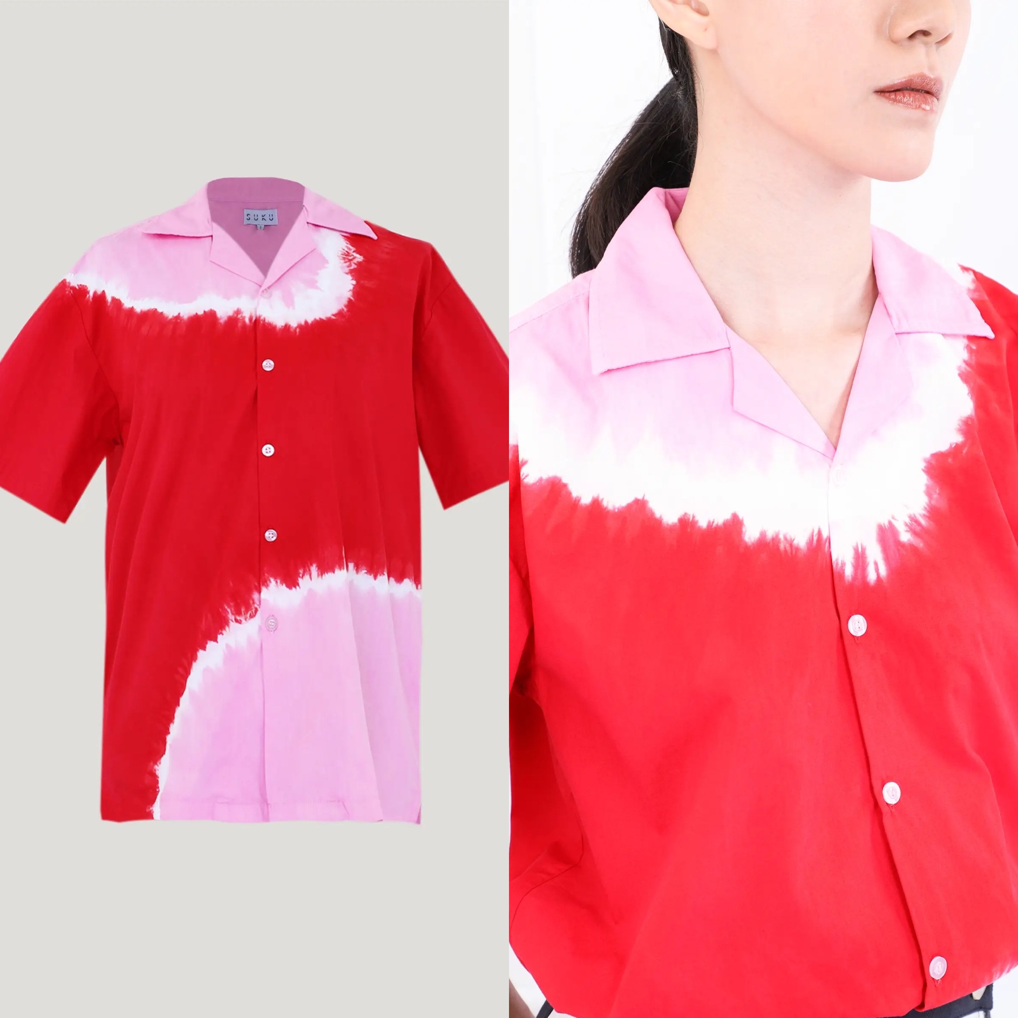 Untuk tie-dye yang satu ini, menggunakan warna merah merona dengan warna merah jambu yang lembut sebagai warna utamanya. Sehingga sesuai dengan namanya, kemeja ini memberikan nuansa sunkissed!