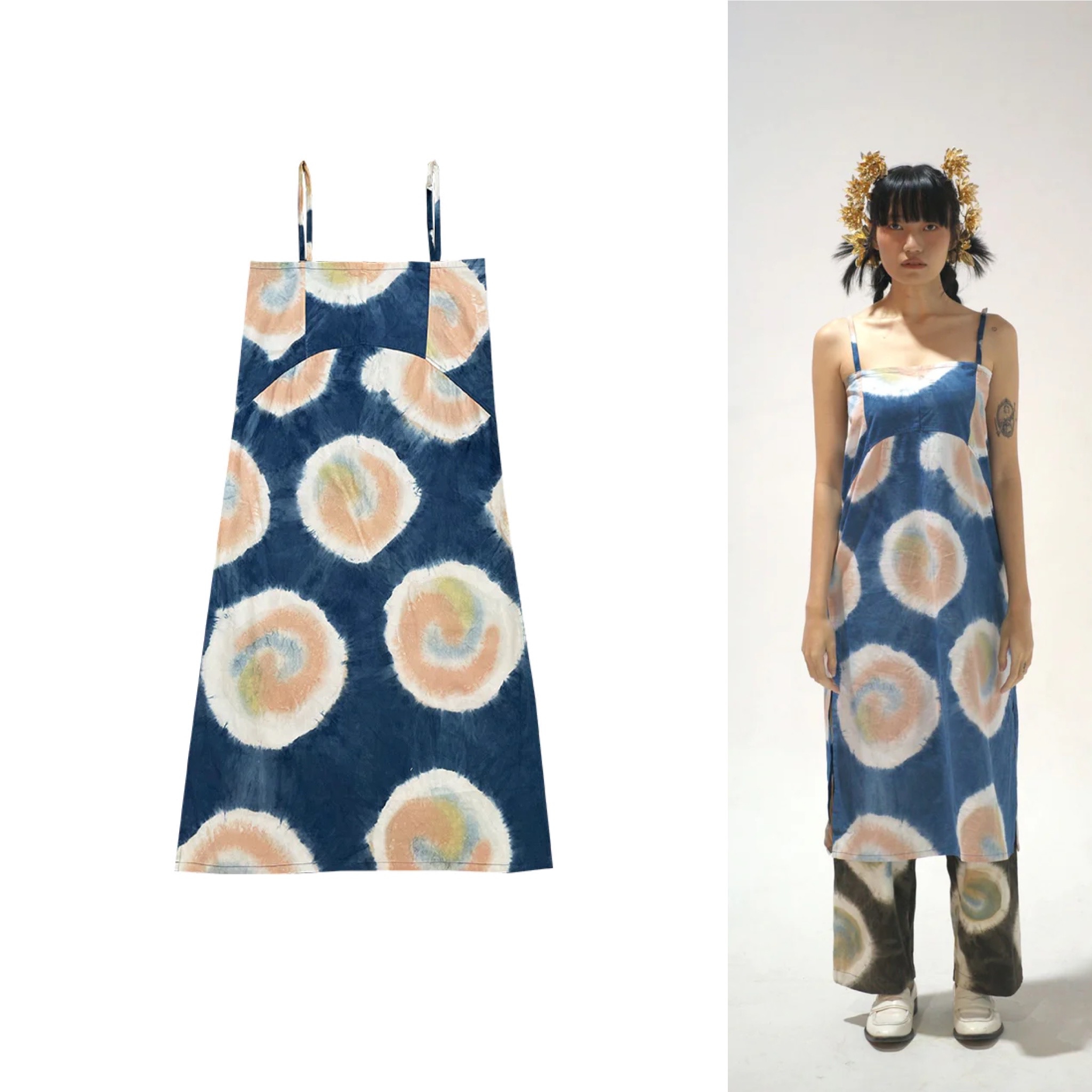 Masih di pakaian terusan, kali ini ada gaun dengan motif tie-dye melingkar tersebar dengan indah di atas gelapnya permukaan biru indigo. Ditambah lagi, motif tersebut diciptakan melalui proses alami.