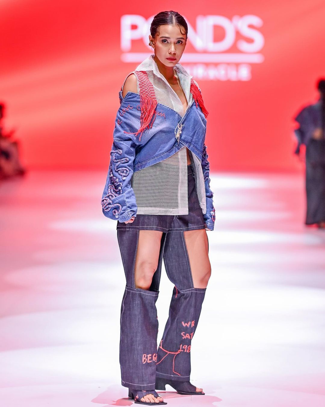 Untuk Adinia Wirasti, sang aktris tampil ala street style dari jelema Alto Project karya desainer Cynthia Vicario. Adinia terlihat fierce dengan atasan putih bertekstur “fish-net”, jaket cropped oversized denim berdetail fringe merah ,dan celana cut-out jeans yang edgy. Tampilan ini memadukan gaya kasual dan eksperimental, memperlihatkan kesan berani dan modern yang sesuai dengan aura Adinia di landasan mode.