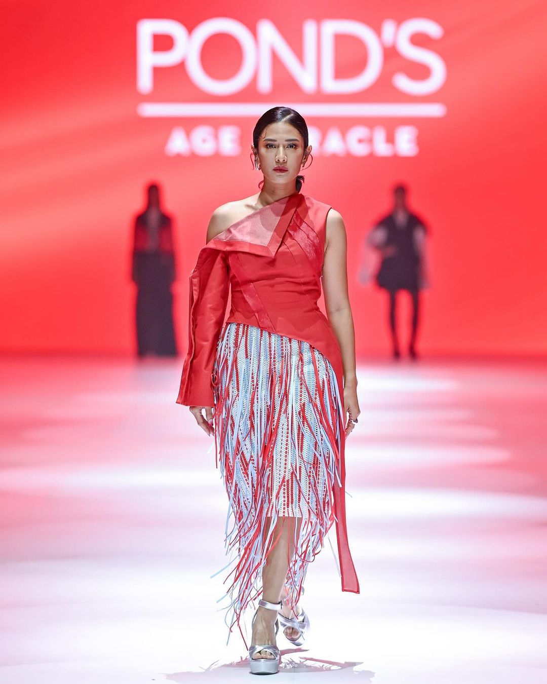 Dengan karya busana dari Natalia Kiantoro, Dian Sastro sebagai Brand Ambassador Pond's Age Miracle tampil memukau dalam atasan merah asimetris dengan detail draping, dan rok berumbai berwarna merah dan putih. Busana ini memberikan tampilan yang edgy namun elegan. Kombinasi bahan transparan dan tekstur unik menciptakan gaya dinamis untuk Dian di landasan mode ini.
