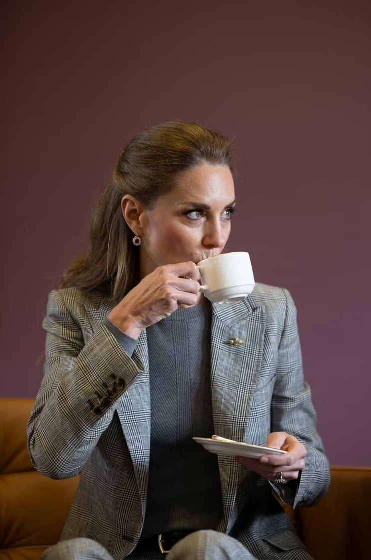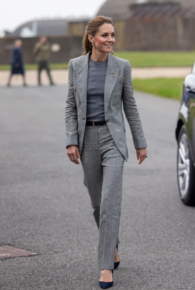 Hari ini, Putri Catherine tampil anggun dalam setelan abu-abu bermotif kotak yang terdiri dari blazer pas badan dan celana panjang berpotongan lurus dengan pinggang tinggi, saat mengunjungi RAF Coningsby di Lincolnshire, Inggris, dekat desa Coningsby.