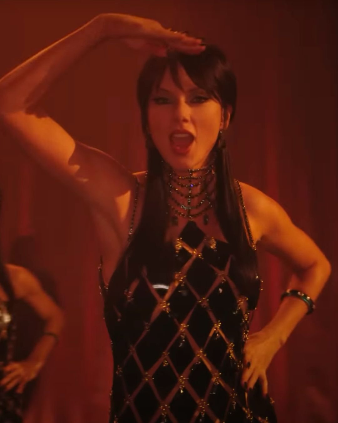 Dari sini, Taylor melompat satu dekade ke depan untuk menghadirkan momen kabaret bergaya The Ronettes, tampil sebagai bagian dari trio penyanyi perempuan dengan gaun rantai logam hitam seragam rancangan Roberto Cavalli. Busana tersebut didesain dengan choker bertatahkan kristal dan potongan halter-neck yang membentuk siluet tegas, dibuat dari potongan kulit metalik biru kehijauan berbentuk berlian serta motif macan bertatah permata. Taylor memadukan gaun itu dengan anting safir dari Jennifer Behr dan wig berwarna cokelat tua.
