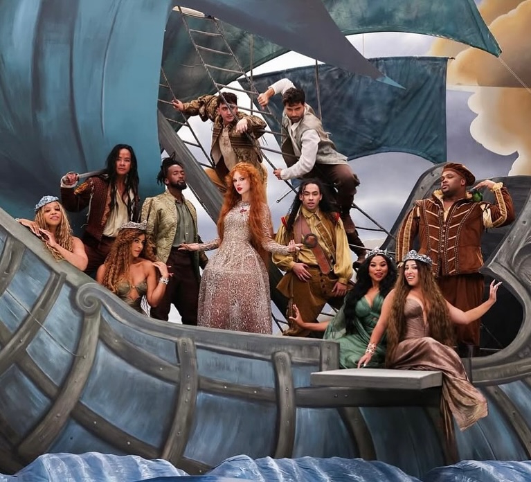 Untuk adegan dramatis di atas kapal, di mana Taylor memerankan seorang aktris panggung yang terlempar dari kapal dan tenggelam di lautan (sangat bernuansa Ophelia), Joseph Cassell menggandeng desainer Paolo Sebastian untuk menciptakan gaun yang sama memukaunya. Busana berlengan panjang itu dirancang dengan korset terbuka dan mini cage crinoline, dihiasi payet kristal buatan tangan serta motif hati dan panah dari koleksi A Lover’s Kiss milik sang label. Dalam video tersebut, Taylor mengenakannya bersama wig merah panjang yang memperkuat kesan teatrikal dan tragis.