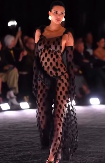 Di balik gaun transparan itu, sang model hanya mengenakan string thong hitam. (Sementara sang adik, Kylie yang tampil memesona dalam gaun rantai perak, duduk di barisan depan pertunjukan sambil memberikan dukungan untuknya.)