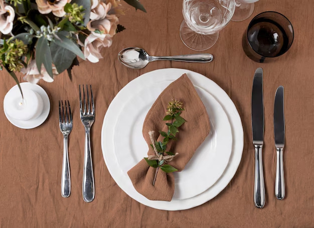 Taplak meja memiliki peran penting dalam menciptakan suasana. Pastikan ukurannya proporsional dengan meja dan sesuai dengan warna tema acara. Untuk kesan elegan, pilih bahan berkualitas seperti linen atau satin. Taplak yang rapi dan bersih juga menambah nilai estetika serta memperkuat karakter visual keseluruhan meja. - Atur Posisi Alat Makan dengan Tepat