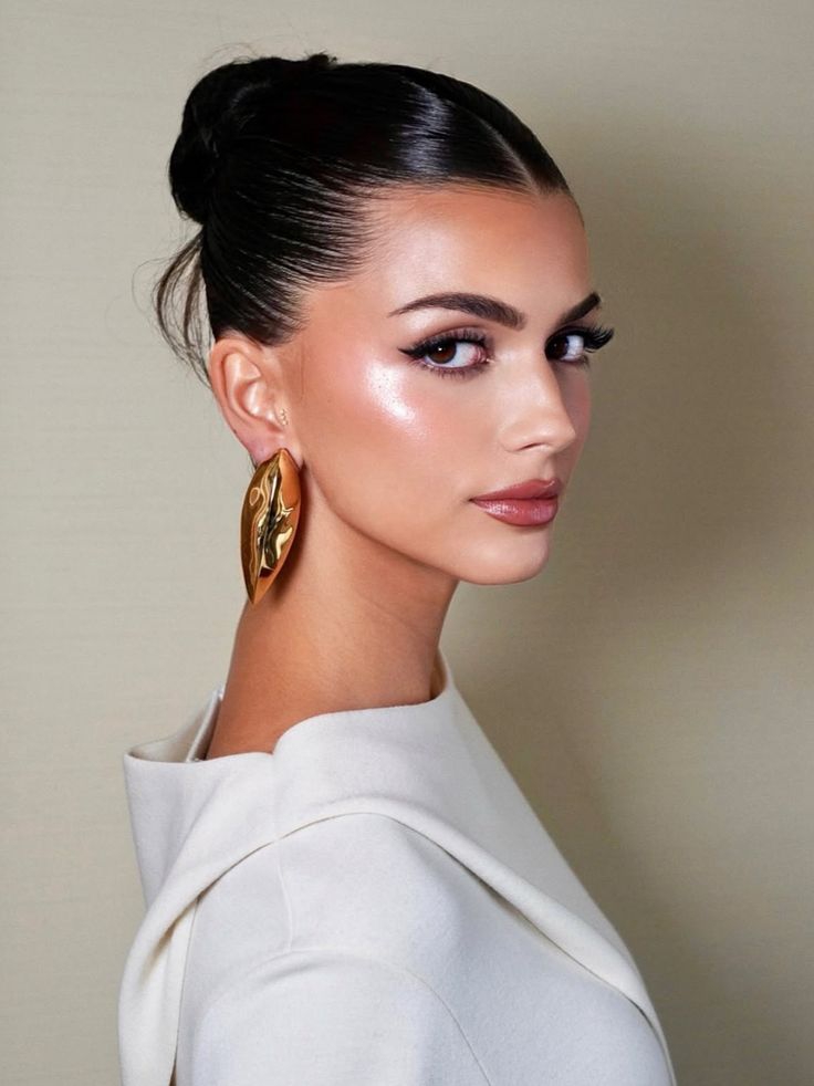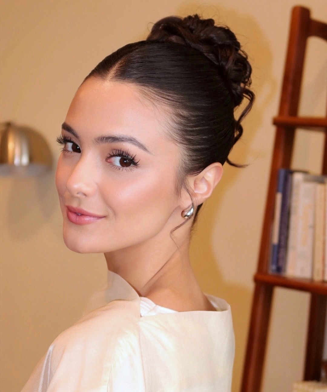High bun atau sanggul tinggi memberikan kesan megah dan anggun, menjadikannya pilihan ideal bagi pengantin yang ingin tampil elegan di acara formal. Rambut disanggul tinggi di puncak kepala, menciptakan efek leher lebih jenjang dan wajah lebih tegas. Model ini cocok untuk gaun berpotongan klasik atau mewah. Tambahkan aksesori seperti tiara, hairpiece berlian, atau veil panjang untuk hasil akhir yang glamor. Selain menawan, gaya ini juga praktis karena tetap rapi meski digunakan berjam-jam.