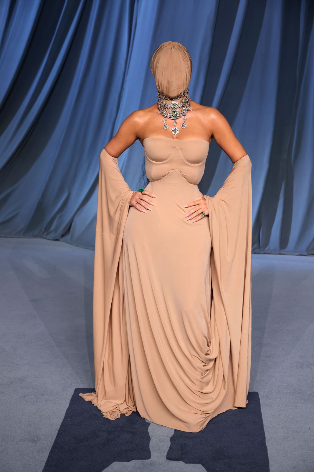 Mengenakan Schiaparelli dan perhiasan Tiffany & Co.