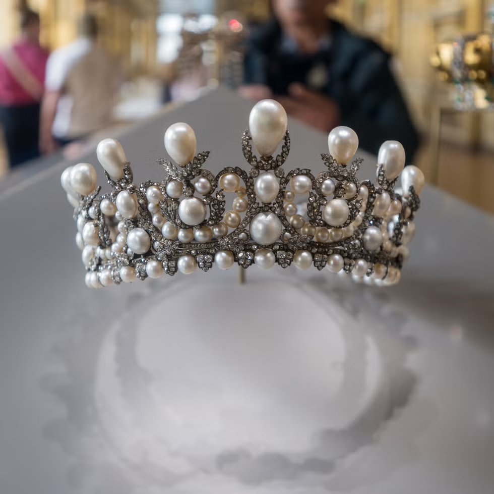 Dalam sebuah lelang di Sotheby’s pada tahun 2018, kalung liontin mutiara yang pernah dimiliki Marie Antoinette terjual dengan harga rekor 36 juta dolar AS. “Masalahnya, benda-benda seperti ini memang tidak tergantikan,” kata Hartley. “Setiap bagiannya akan diperiksa dengan sangat teliti sebelum digunakan... setiap mutiara, setiap detailnya harus benar-benar yang terbaik.” Dalam kasus tiara ini, keunikan setiap mutiara semakin disempurnakan oleh rangka perhiasan yang dihiasi hampir 2.000 berlian yang tertanam dalam perak, berpilin dan berputar di sekitar setiap butir mutiara yang berkilau.