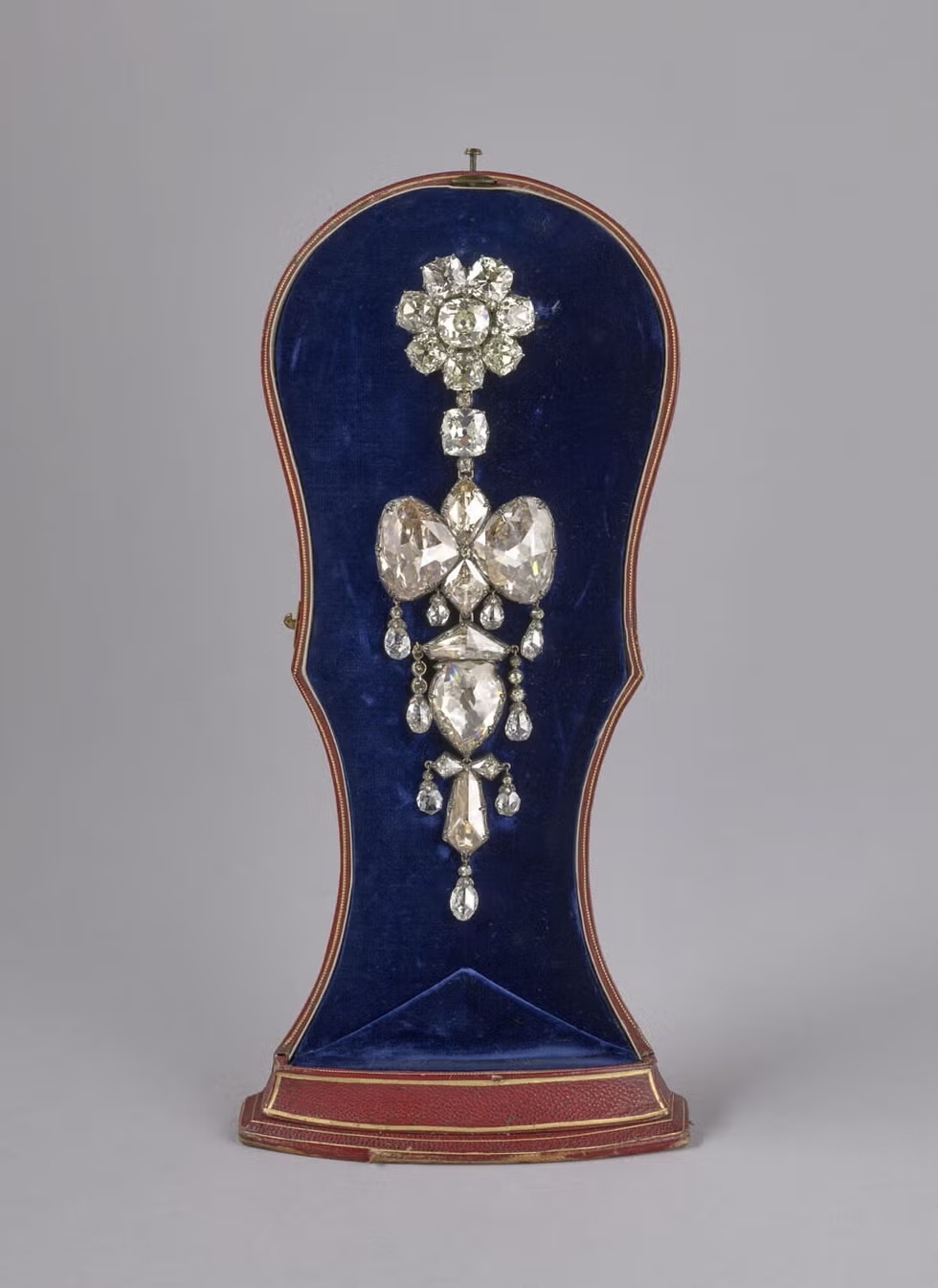 Bros ini, yang terdiri dari 94 berlian, merupakan pelajaran tentang keahlian pahat yang luar biasa. Dari atas hingga bawah, berlian dipotong dengan ketelitian tajam, menghasilkan karya gantung di mana berlian berbentuk tetesan air menetes seperti embun yang berkilau dengan simetri sempurna. “Dalam beberapa hal, karena posisi Prancis di dunia—di puncak masyarakat terdidik dan berbagai kalangan aristokrat maka perhiasannya sangat berani. Ukurannya besar dan seolah berkata, ‘Saya hadir di sini!’” kata Andrea. “Jadi, saya rasa aspek ini benar-benar merupakan salah satu sisi non-materiil dan tidak tergantikan dari perhiasan ini, dan alasan mengapa kehilangan ini begitu besar. Bukan hanya publik sekarang tidak bisa melihat jenis perhiasan yang jarang terlihat, tetapi mereka juga kehilangan kesempatan untuk mengakses sebuah artefak.”