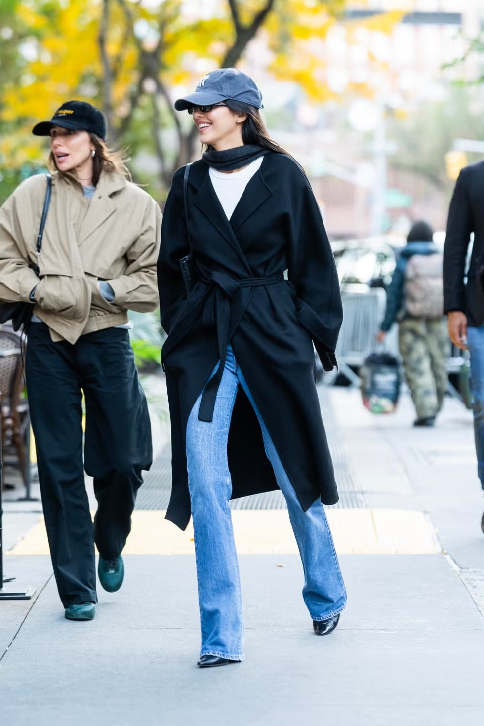 Kendall memadukan kaus putih sebagai dalaman di balik mantel wol hitam yang dilengkapi ikat pinggang di bagian depan serta garis leher V yang dalam. Untuk sentuhan elegan, sang supermodel menambahkan syal abu-abu yang disampirkan anggun di sekitar lehernya.