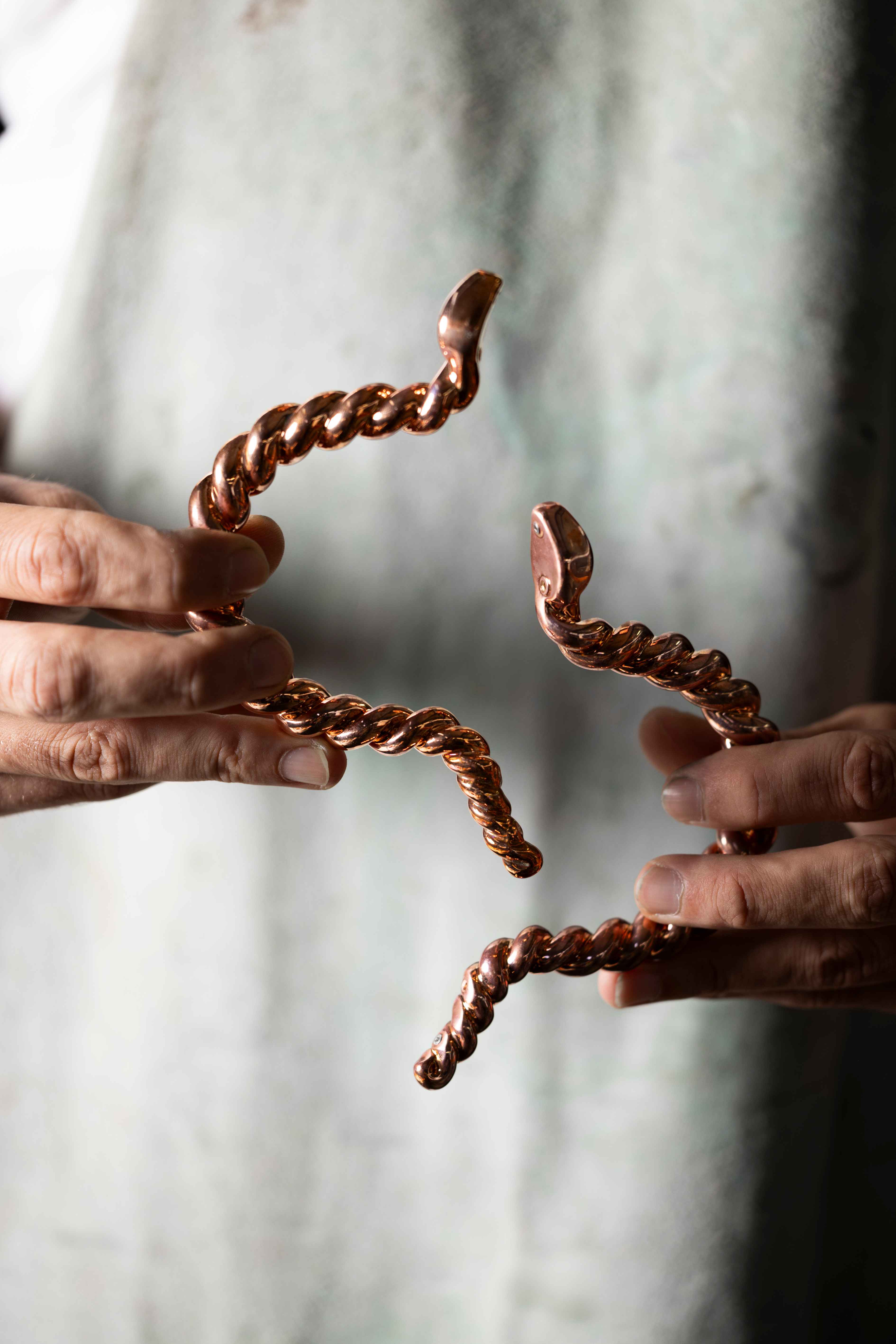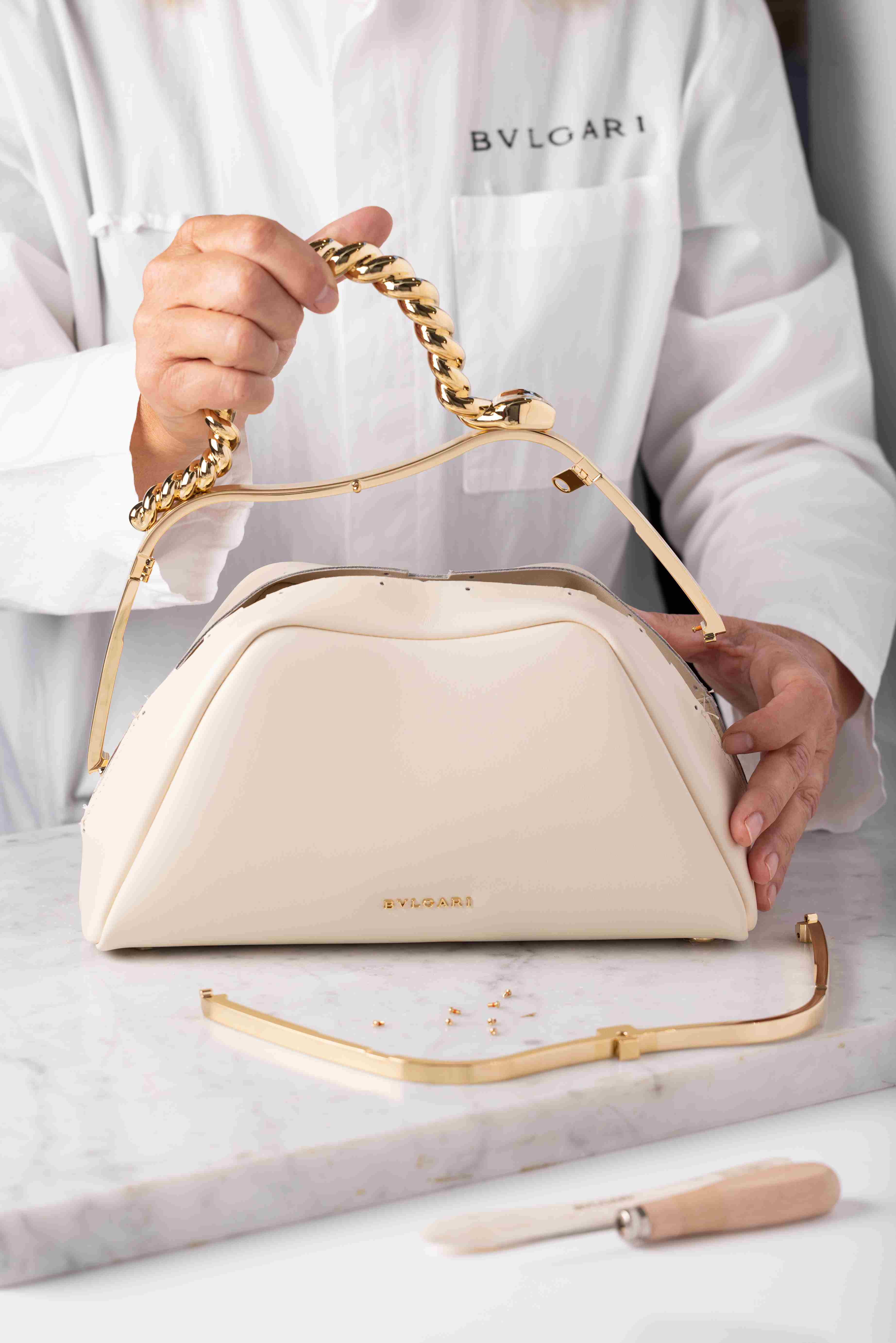 Karya hasil kolaborasi ini memadukan sensualitas garis-garis S-shape khas ular dengan sentuhan passementerie hiasan rumit hasil kerja tangan yang menjadi ciri khas Destree. Menariknya, elemen ini ternyata juga memiliki jejak sejarah di Bvlgari pada awal abad ke-20, pita passementerie pernah digunakan untuk menggantungkan liontin dan kalung. Kini, detail itu hadir kembali dalam bentuk tali berpilin dari logam yang dibuat menggunakan teknik electroforming inovatif, menghasilkan struktur yang ringan namun tetap presisi. Perpaduan savoir-faire antara dunia perhiasan dan seni kerajinan kulit inilah yang menciptakan paradoks indah dengan sebuah karya dengan bobot nyaris mustahil, namun tetap menghadirkan kesan kemewahan yang kuat dan berkarakter.