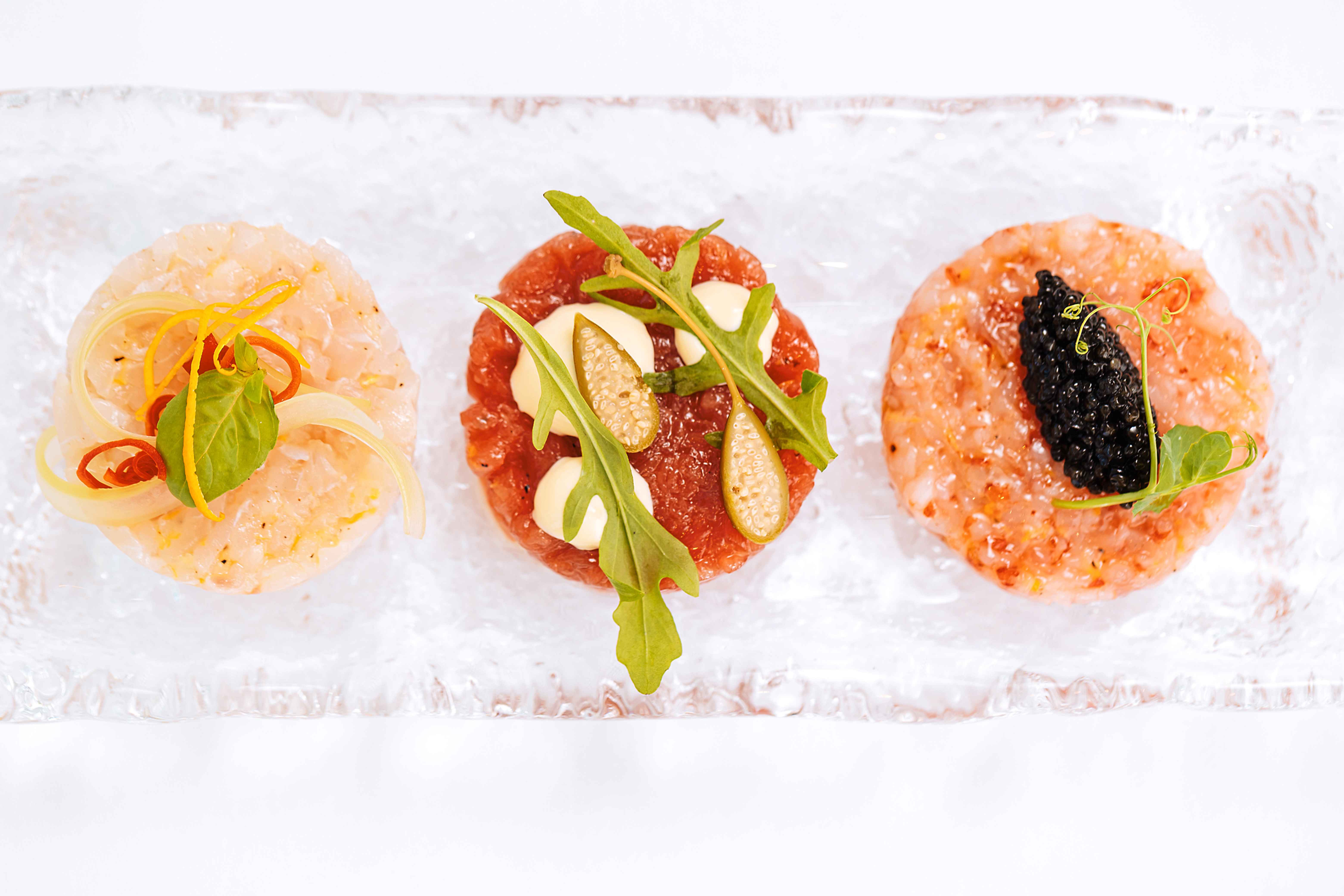 Menu di L’Amo Bistrò del Mare adalah sebuah selebrasi rasa pesisir Italia, mengangkat bahan musiman, resep tradisional, serta teknik kuliner yang telah diwariskan turun-temurun. Di bawah visi kreatif Chef Daniele, setiap hidangan memadukan semangat Mediterania dengan estetika modern, menciptakan harmoni antara cita rasa, aroma, dan visual yang menggugah. Salah satu hidangan pembuka andalan adalah Le Tre Tartare ($88), yang menampilkan tiga varian tartare dalam interpretasi berbeda yaitu ikan kakap putih berpadu dengan telur ikan belanak dan kulit jeruk manisan; perut tuna kenyal dengan mayones jeruk nipis Jepang dan selada air kacang polong serta udang merah Sisilia dari Mazara del Vallo yang disempurnakan dengan kaviar lembut. Hidangan lain seperti Polpo al Josper ($32), menghadirkan gurita yang dipanggang perlahan dalam oven Josper hingga beraroma asap lembut, disajikan di atas puree wortel, jahe, dan kapulaga, serta dilengkapi dengan daun bawang panggang dan kentang renyah yang memperkaya tekstur.
