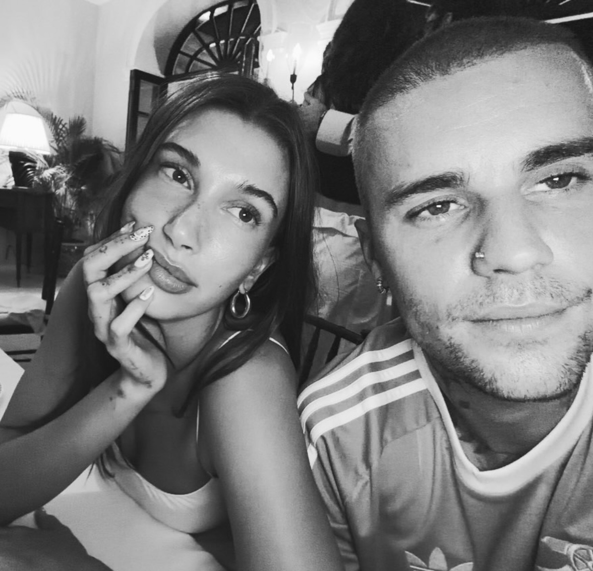 Unggahan pertama menampilkan swafoto hitam-putih saat Justin bersandar manja di samping Hailey saat makan malam. Penyanyi pop itu mengenakan jersey sepak bola sementara sang istri yang merupakan pengusaha kecantikan tampil dengan atasan tali spaghetti berwarna putih.