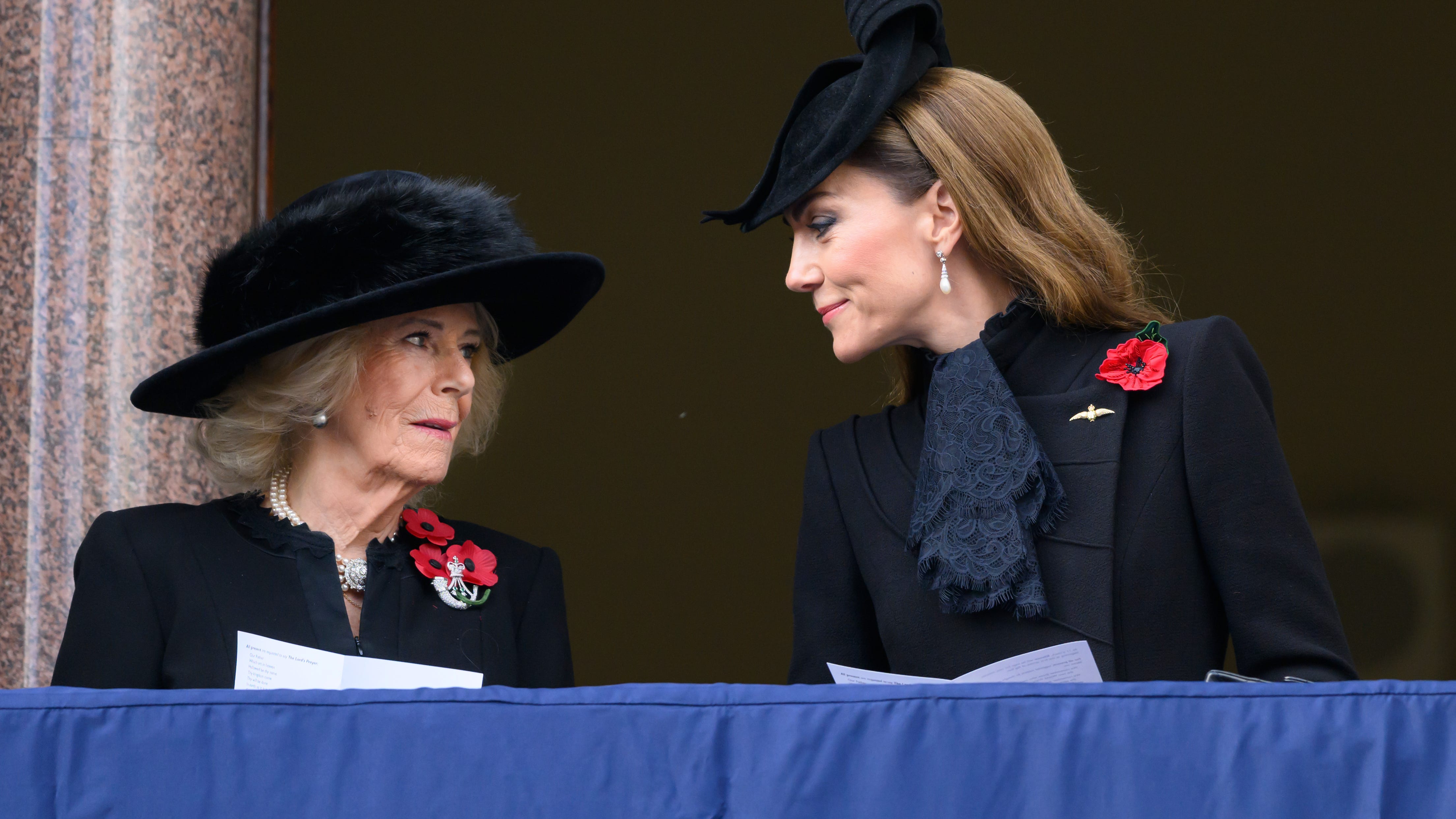 Di sisinya, Ratu Camilla tampil serasi dengan topi hitam miliknya sendiri, meski ia memilih model bertepi lebar dengan detail bulu. Ia memadukannya dengan kalung mutiara mencolok dan anting senada, serta mengenakan mantel beritsleting yang dirancang dengan bahu tegas dan kerah bergerigi. Sama seperti Putri Kate, ia juga menghiasi luaran tersebut dengan bunga poppy, dan keduanya tampak sangat selaras dalam penampilan mereka.