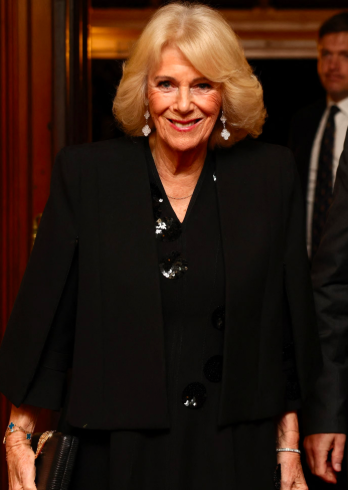 Dalam balutan busana Alessandra Rich dengan bunga poppy buatan tangan khusus serta perhiasan keluarga kerajaan, termasuk anting milik Ratu Elizabeth II dan cincin peninggalan Putri Diana.