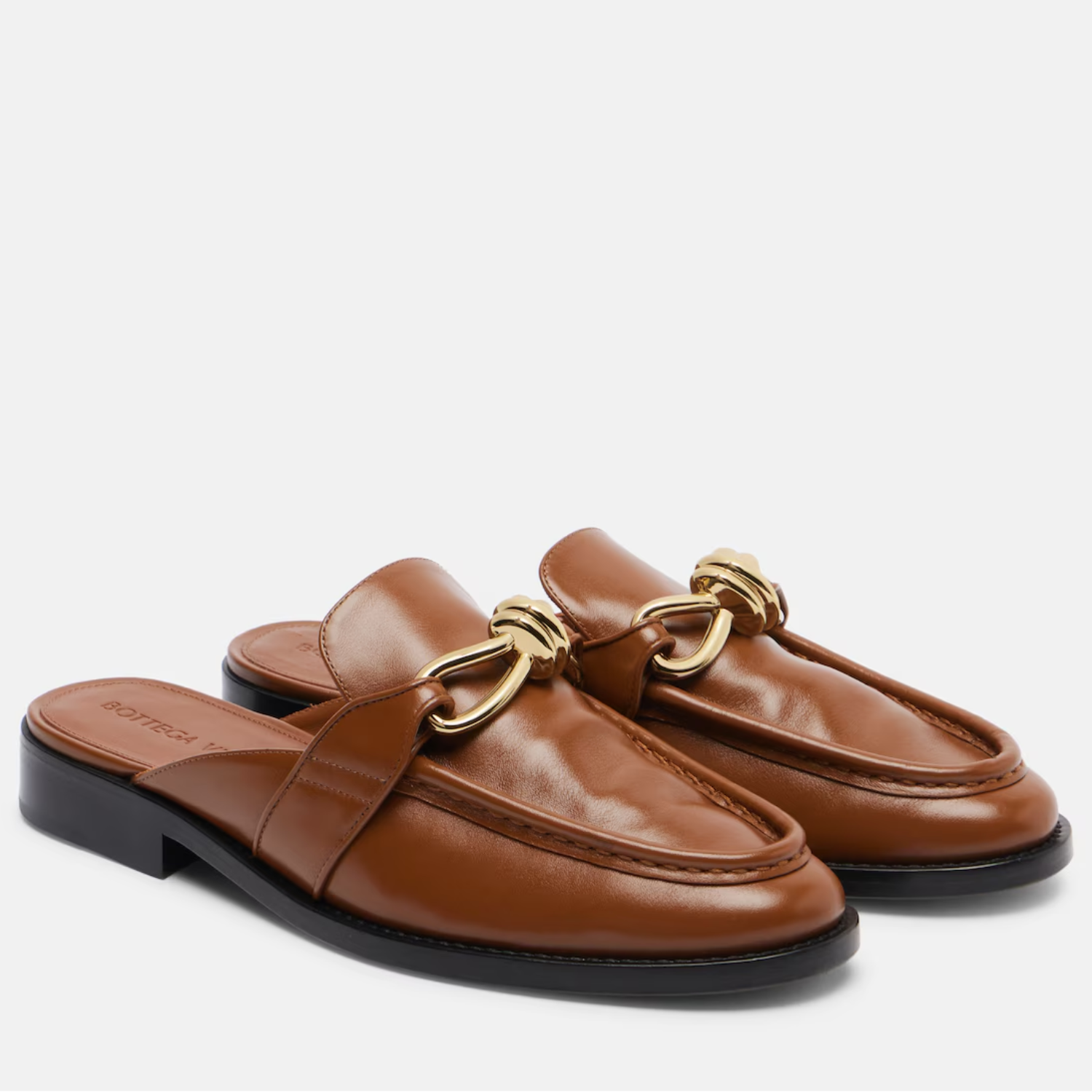 Astaire Knot Mules menggabungkan konstruksi lembut dan detail simpul yang menjadi ikon baru Bottega Veneta. Terbuat dari kulit halus dengan hasil akhir matte elegan, model ini memancarkan kesan santai yang tetap sophisticated. Desain terbuka di bagian tumit memberi sentuhan modern pada gaya klasik.