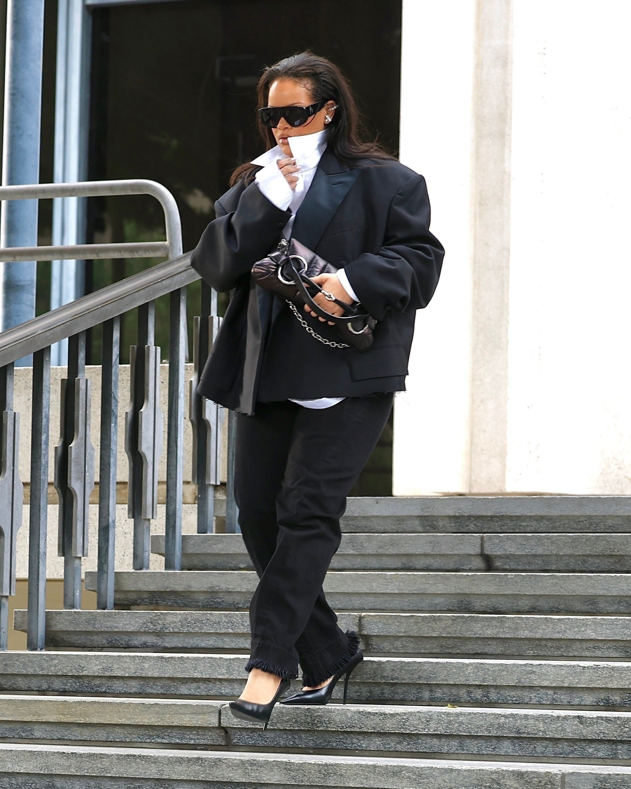 Rihanna kemudian menyempurnakan penampilannya dengan celana panjang hitam senada yang juga memiliki tepi kain terurai, dipadukan dengan sepatu patent leather pumps hitam mengilap dari Balenciaga. Sesuai ciri khasnya yang gemar memadukan berbagai label mewah, ia juga membawa tas tangan horsebit dari Gucci serta mengenakan kacamata hitam bermodel masker dari The Attico.