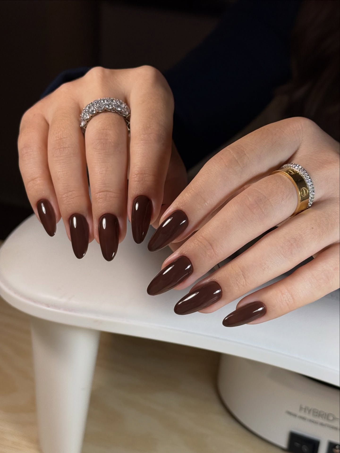 Mirip coklat namun lebih hangat dan creamy, warna hazelnut menjadi netral sempurna untuk dipakai sepanjang musim dingin, terutama dengan hasil akhir high-shine dan bentuk kuku almond yang memanjang seperti contoh ini.