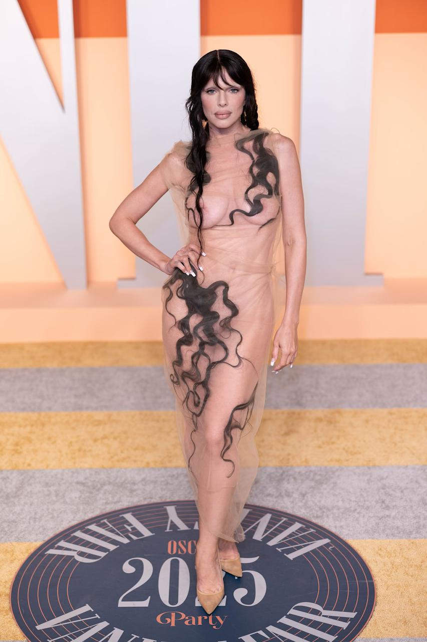 Dalam gaun naked berbahan bulu karya Dilara Findikoglu di pesta Oscar Vanity Fair 2025.