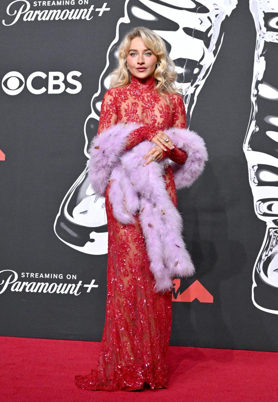 Dalam gaun renda merah berkerah tinggi dari Valentino, lengkap dengan syal bulu ungu di 2025 VMAs.