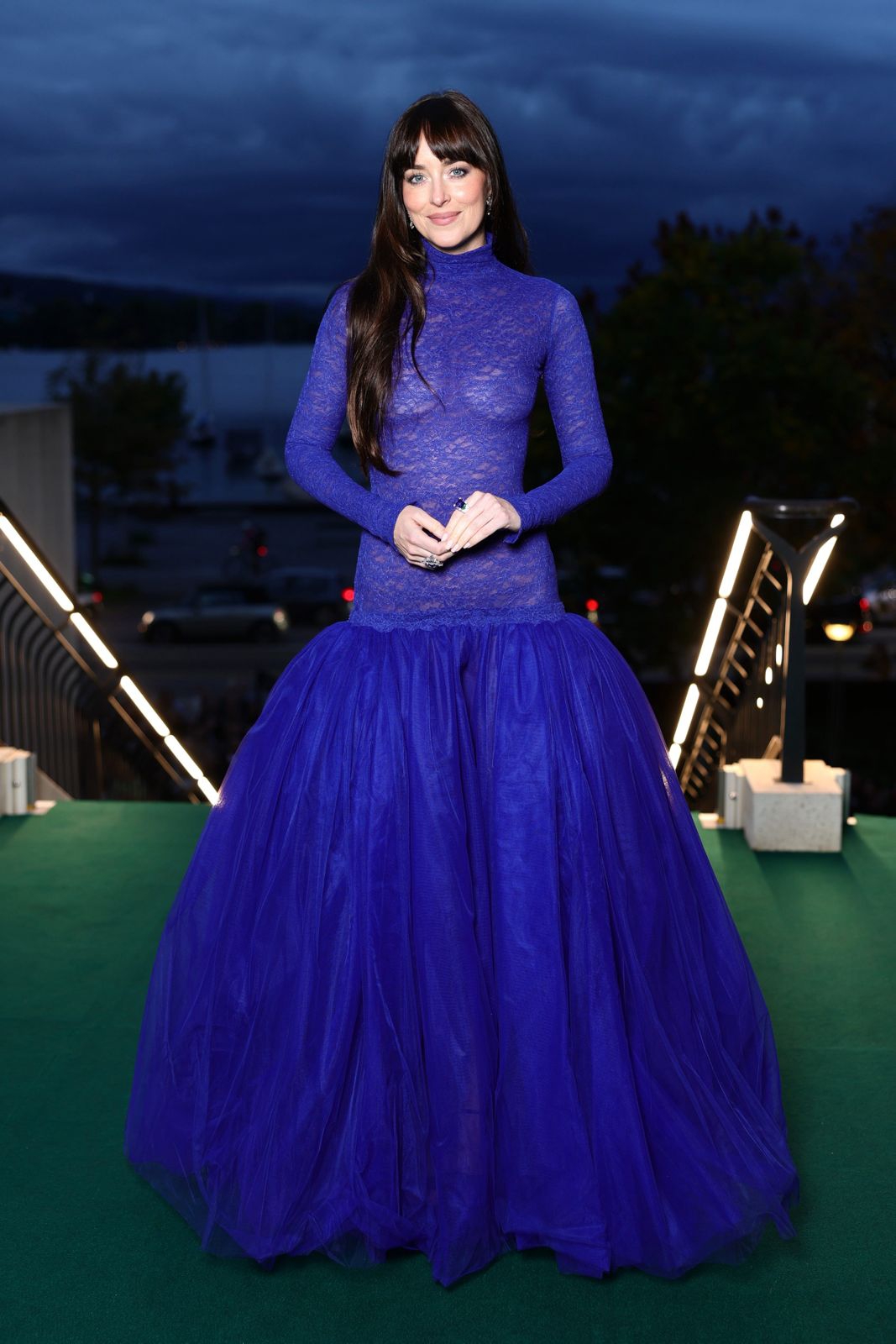 Dalam gaun biru terang berpotongan drop-waist dari Gucci di Zurich Film Festival 2025.