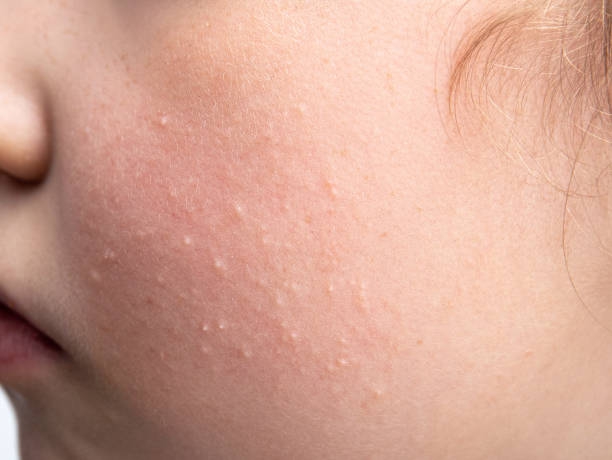 Milia neonatorum biasanya muncul pada bayi dalam beberapa minggu pertama kehidupan. Benjolan kecil berwarna putih atau kekuningan muncul di wajah, terutama pipi, hidung, atau dagu bayi. Kondisi ini terjadi karena kelenjar kulit bayi masih berkembang, dan keratin terperangkap di pori. Jenis milia ini umumnya tidak berbahaya dan hilang sendiri dalam beberapa minggu tanpa intervensi medis.