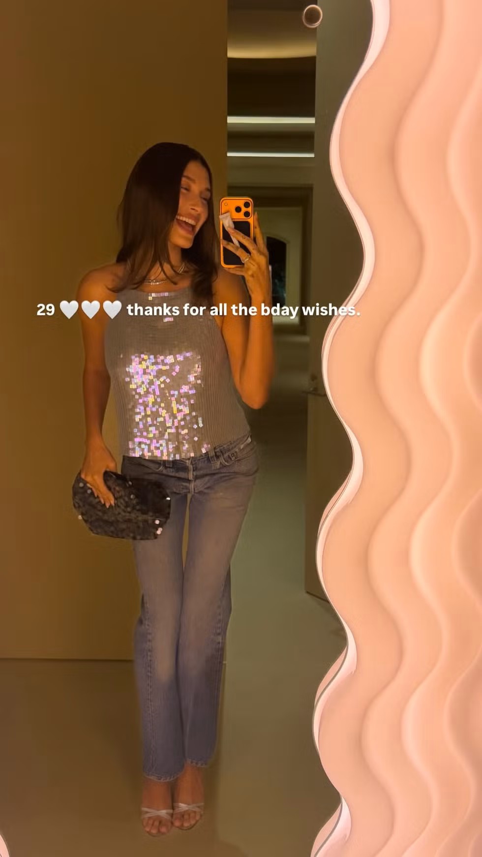 Dalam foto tersebut, Hailey berpose dengan busana ulang tahun yang sempurna. Atasannya berupa halter berpayet perak yang berkilau tertabrak cahaya, dipadukan dengan clutch hitam berpayet yang sama berkilau. Untuk menyeimbangkan gemerlapnya, ia mengenakan jeans biru light-wash klasik dengan potongan low-rise dan siluet lurus. Untuk alas kaki, ia memilih sandal hak ivory yang timeless, dan di lehernya ia menambahkan kalung dua lapis sebagai sentuhan akhir. Rambut coklatnya ditata dengan blowout natural yang halus, serta tentu saja, di ponselnya terlihat lip tint khas Rhode miliknya.