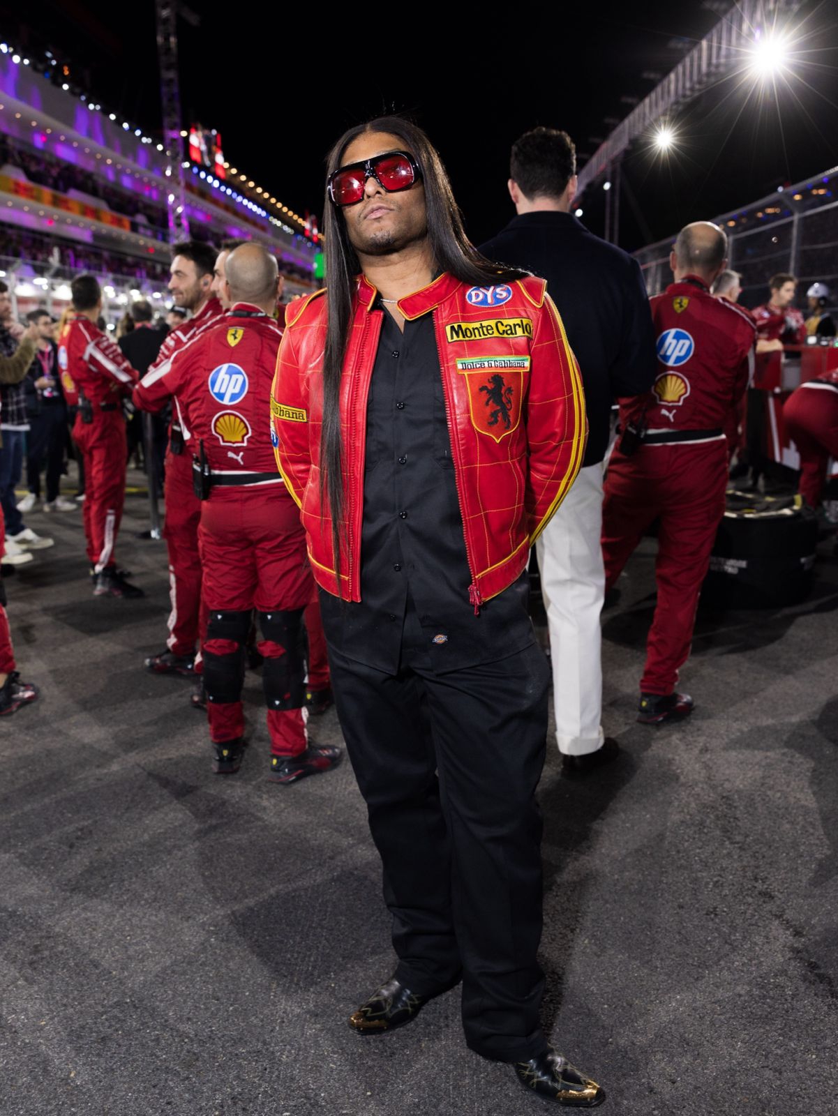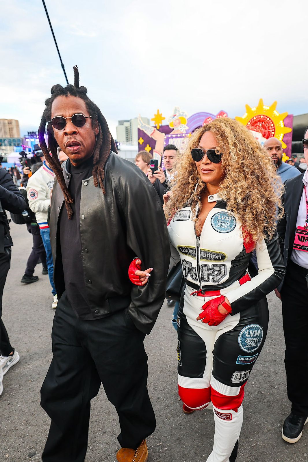 Beyoncé, sebagai permulaan, hadir bukan dengan satu tetapi dua tampilan bertema balap, termasuk tracksuit Louis Vuitton khusus. Dirancang dalam warna putih dengan garis leher terbuka yang dalam serta panel merah dan hitam, busana itu dilengkapi detail LV dan sarung tangan balap berbahan kulit, sempurna untuk acara tersebut. Setelah berganti pakaian, ia muncul kembali bersama Jay-Z dalam bodysuit lateks merah Ferrari dan jaket serasi, dipadukan dengan sepatu hak tinggi merah.