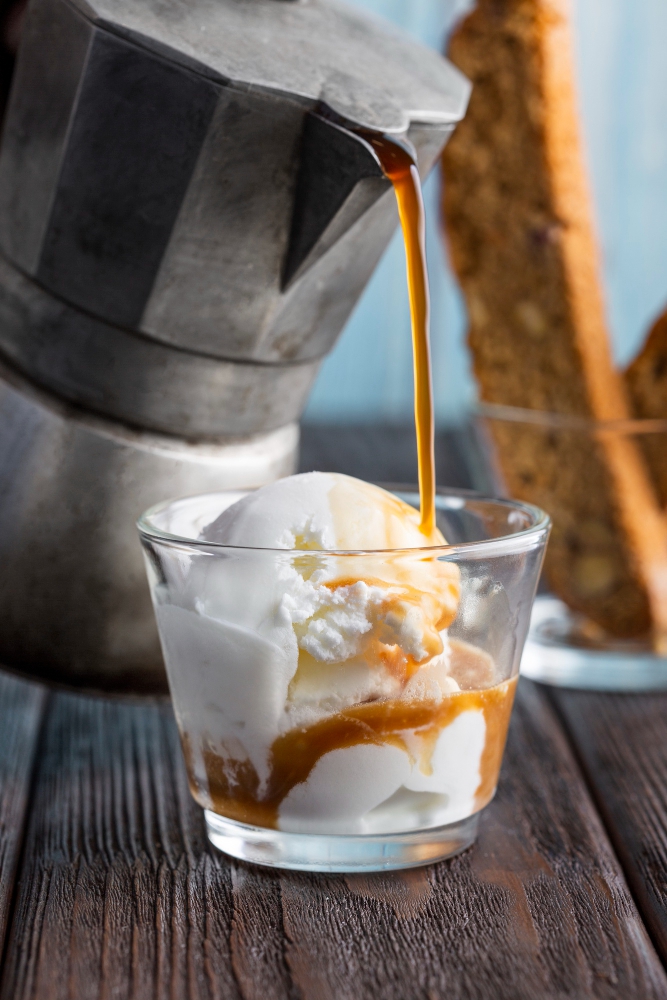 Perpaduan unik antara panas dan dingin: satu shot espresso dituangkan di atas es krim vanila. Jenis ini sering disajikan sebagai hidangan penutup.