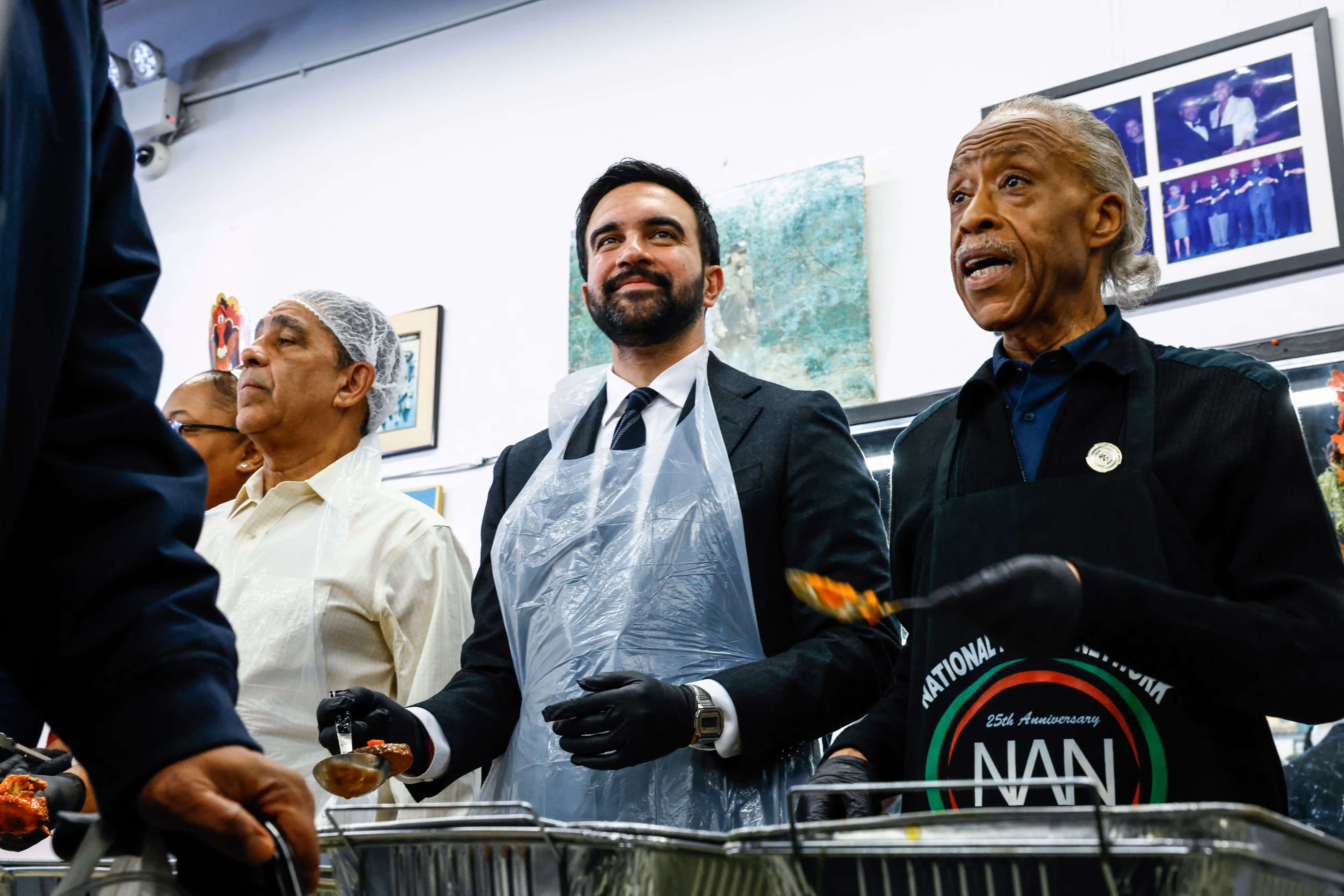 Wali kota terpilih New York City menghabiskan hari itu dengan menyajikan makanan pada acara National Action Network Annual Thanksgiving Feeding di Harlem.