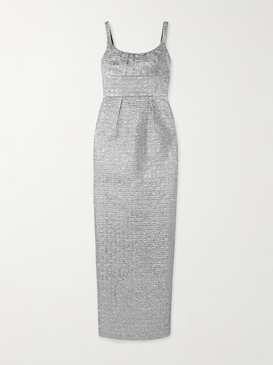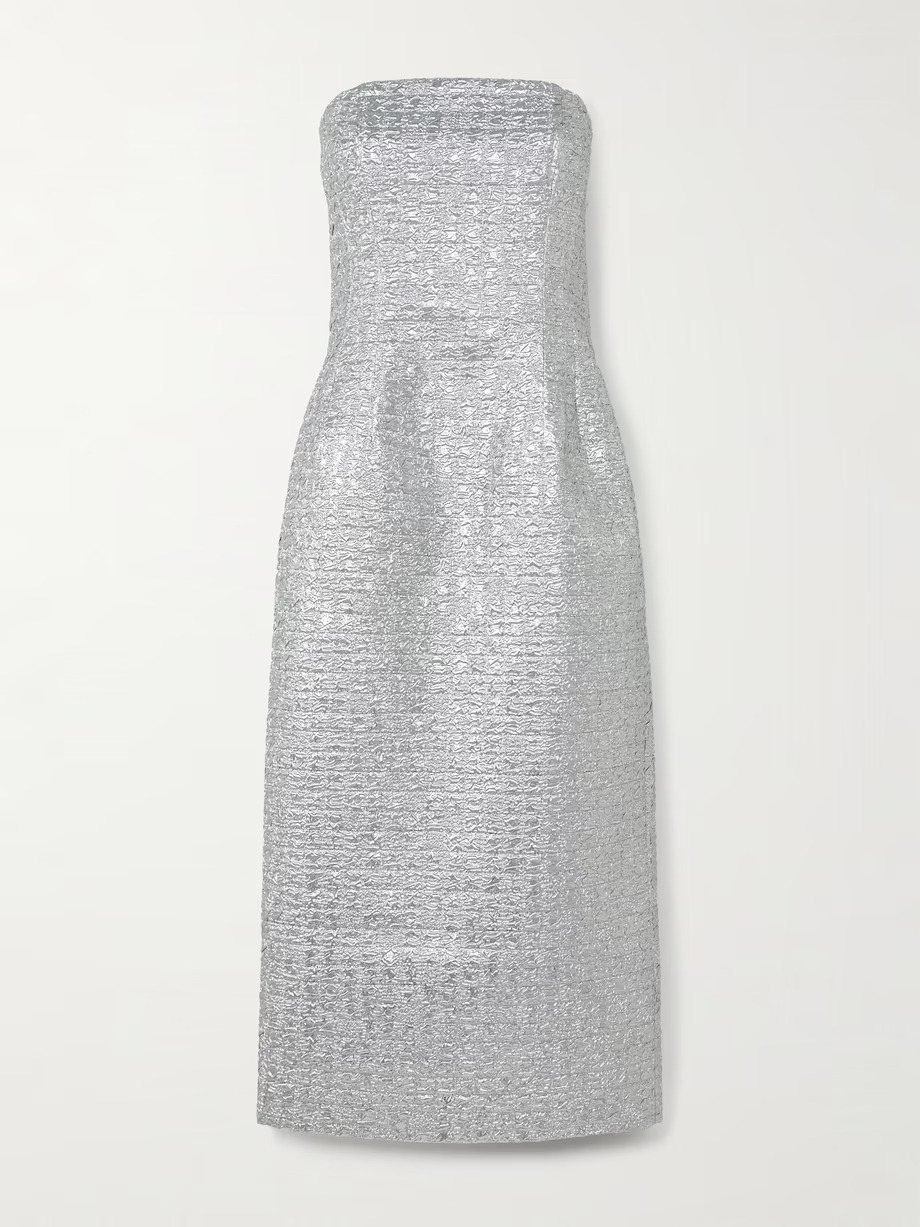 Gaun tube selalu memberikan sentuhan elegan pada tampilan Anda, dan midi dress 'Leila' dari Emilia Wickstead berhasil menemukan keseimbangan antara keanggunan dan keberanian. Dirancang dengan siluet kolom tanpa tali dan pinggang yang pas, gaun ini terbuat dari kain cloqué perak dengan benang metalik yang memantulkan cahaya dari setiap sudut. Gaun ini ideal untuk tampilan yang elegan dengan sedikit kilau. Padukan dengan anting berlian sederhana untuk menyempurnakan estetika yang anggun.