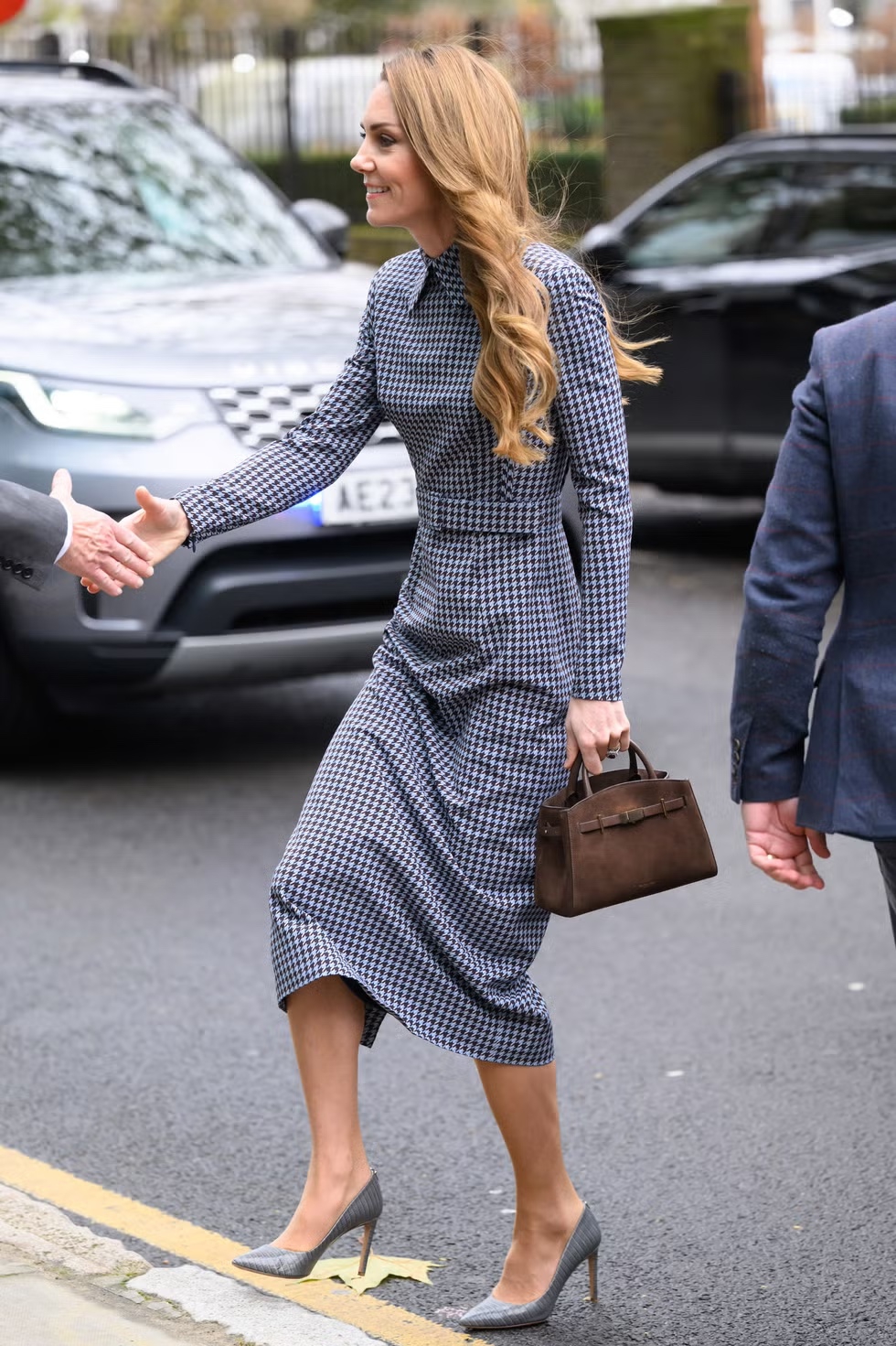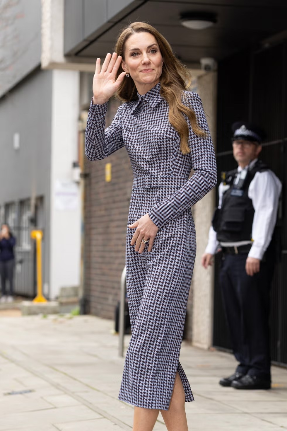 Untuk kesempatan tersebut, Putri Kate memilih gaun midi bermotif houndstooth biru-cokelat dari salah satu label favoritnya, Emilia Wickstead. Gaun berkerah yang sebelumnya pernah dikenakan pada Desember 2022 ini dirancang dengan siluet tailored klasik, berlengan panjang, serta memiliki potongan pinggang tegas yang dipertegas Kate dengan sabuk senada.