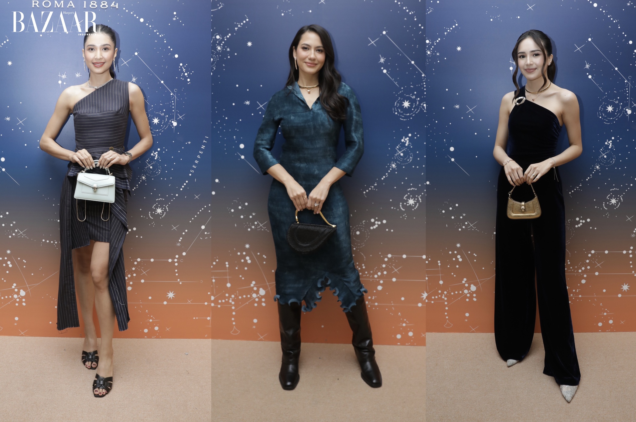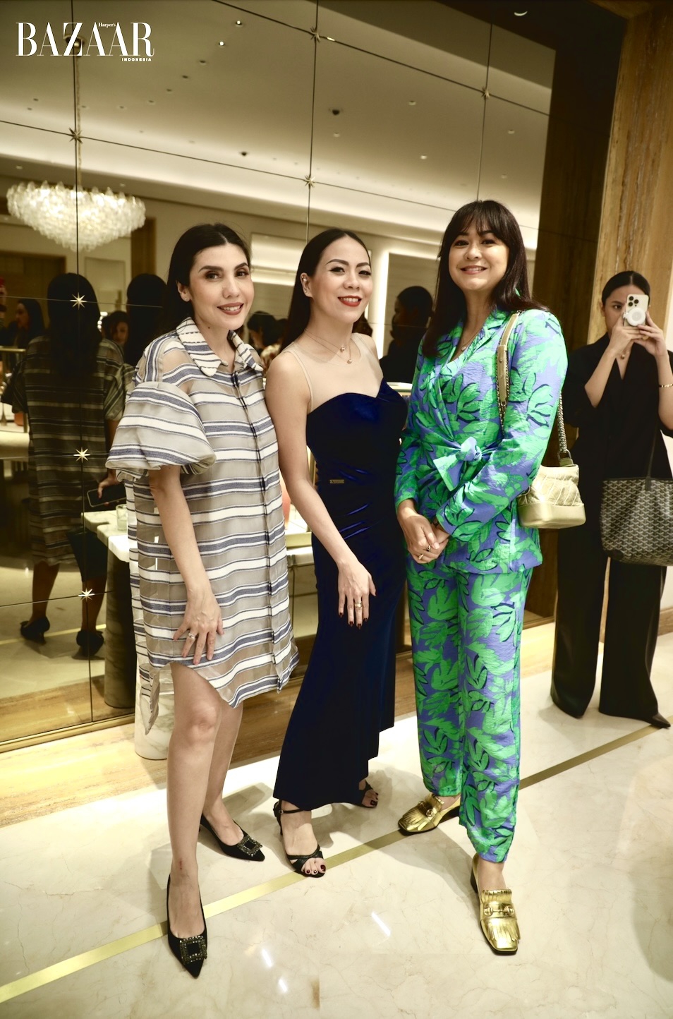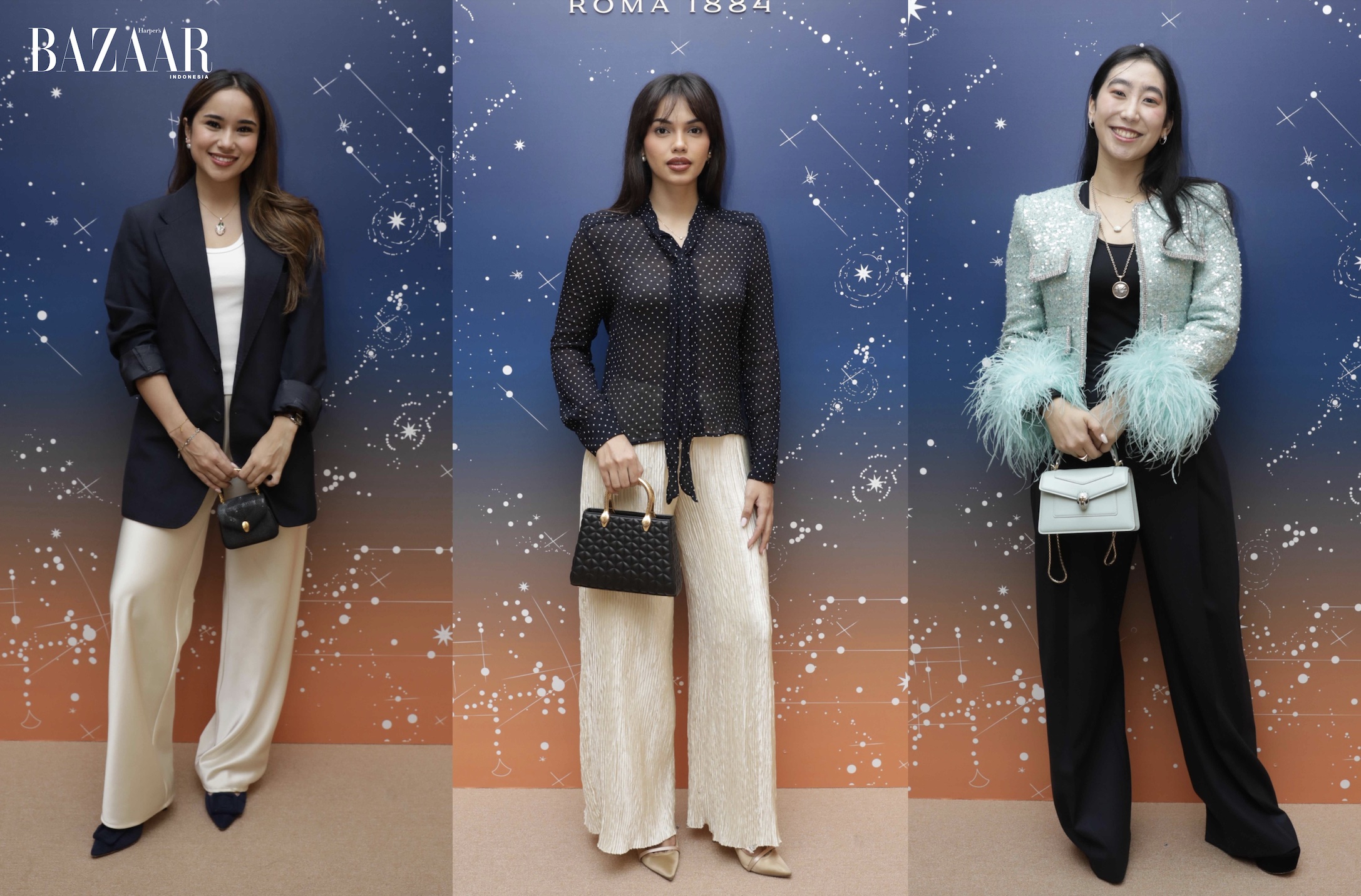 Mikha Tambayong tampil anggun dalam gaun bergaris bernuansa abu-abu, dipadukan perhiasan Bvlgari serta tas Serpenti Forever sebagai sentuhan akhir. Luna Maya menambah kilau malam dengan gaun biru tosca sleeveless, dilengkapi anting dan kalung white gold serta jam Serpenti Tubogas yang menyempurnakan penampilannya. Sementara itu, Beby Tshabina tampil sederhana namun elegan dalam jumpsuit hitam yang dipermanis kilau dari Serpenti Baia Micro Bag yang ia kenakan.