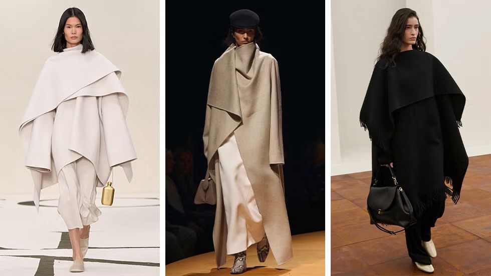 Toteme mungkin menjadi penggerak tren viral dalam dunia scarf jacket, namun siluet berbalut layaknya syal yang dramatis ini kini telah berkembang menjadi salah satu elemen wajib musim dingin. Musim ini, kami kembali menemukan interpretasi baru di Khaite, Calvin Klein, dan Altuzarra, masing-masing menghadirkan volume yang lebih besar, detail fringe yang kaya, serta drapery berukuran oversize yang kian memikat.
