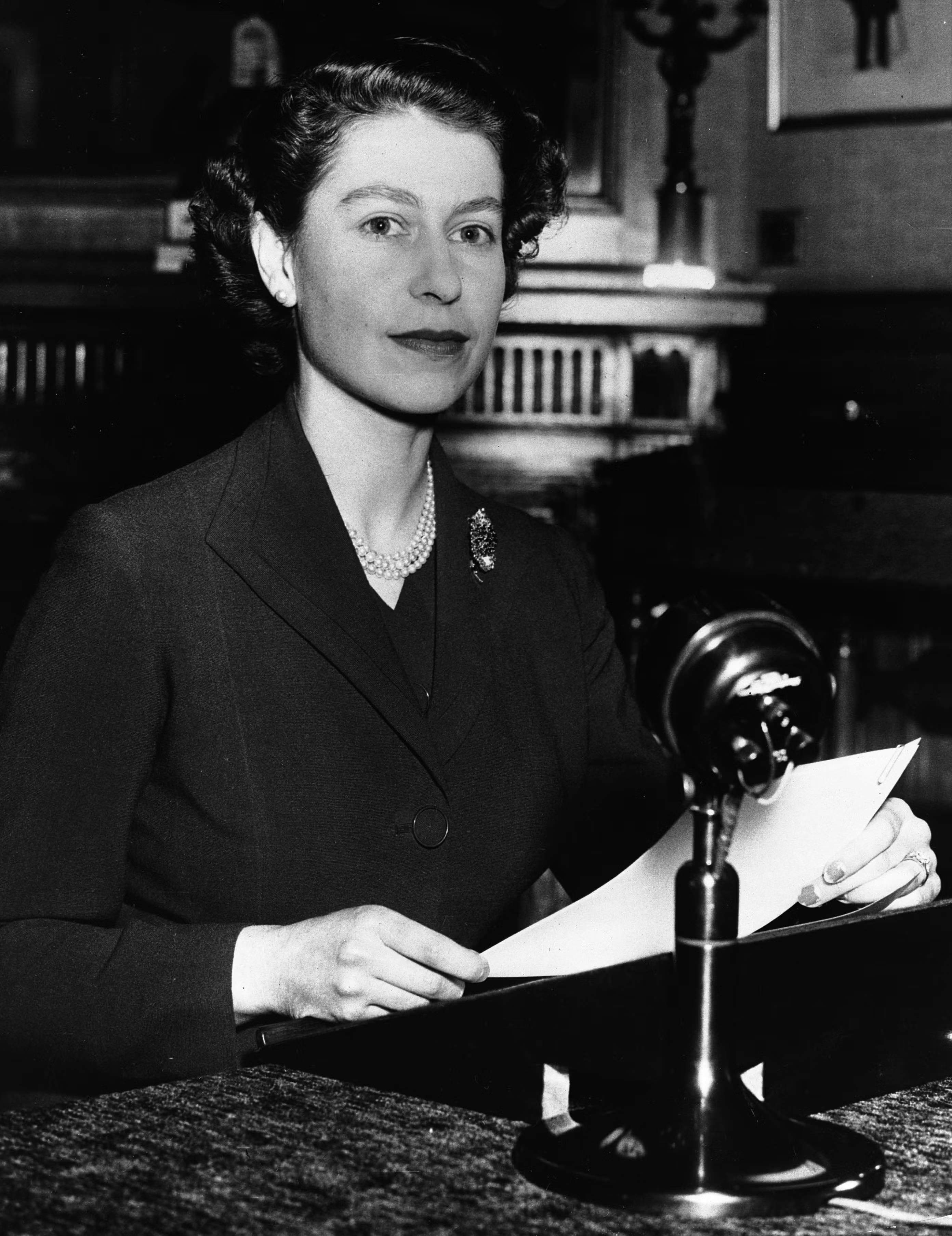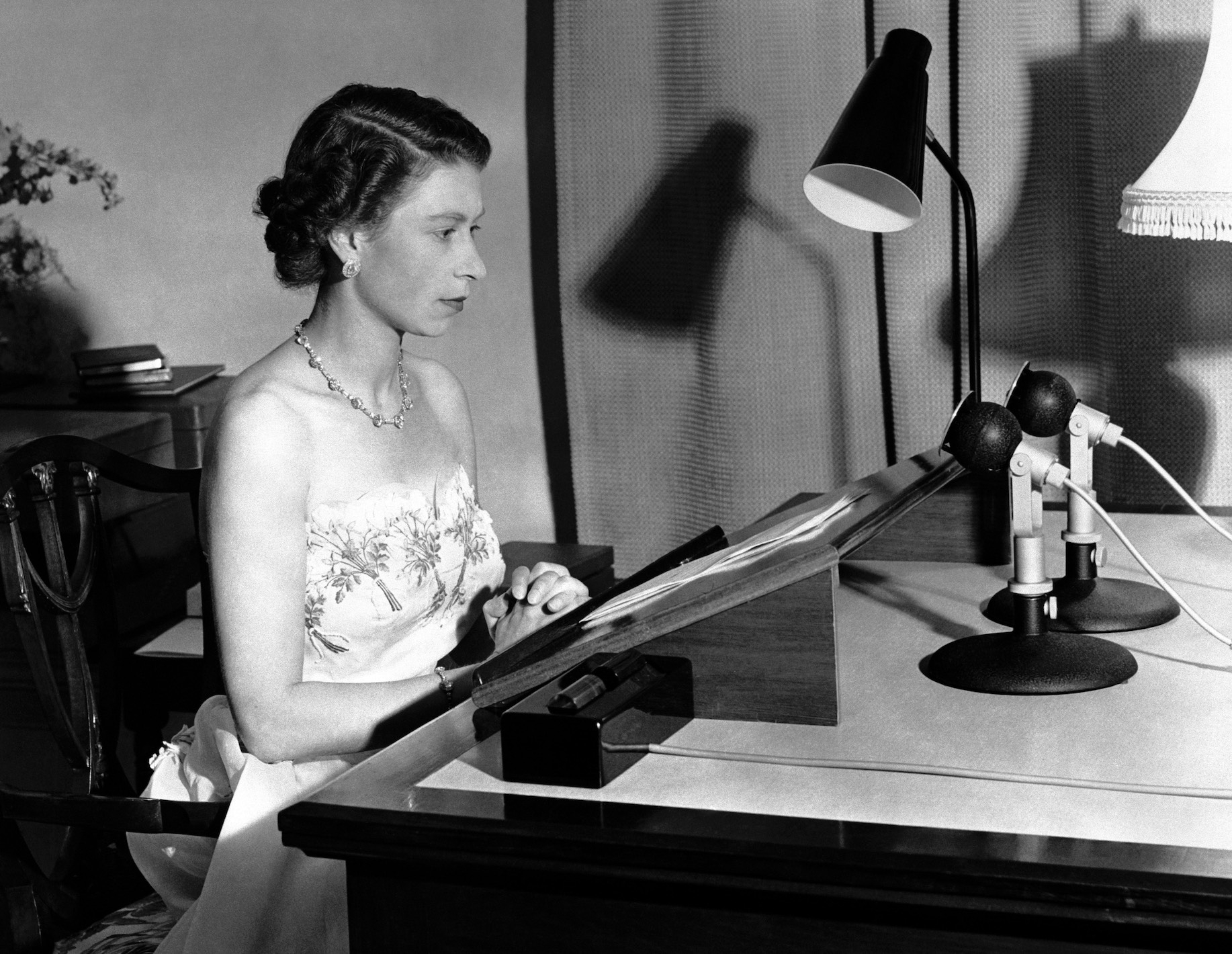 Sang ratu melakukan siaran Natal pertama yang ditayangkan di televisi dari sebuah meja, dikelilingi oleh potret anak-anaknya, Putri Anne dan calon raja saat itu, Pangeran Charles.